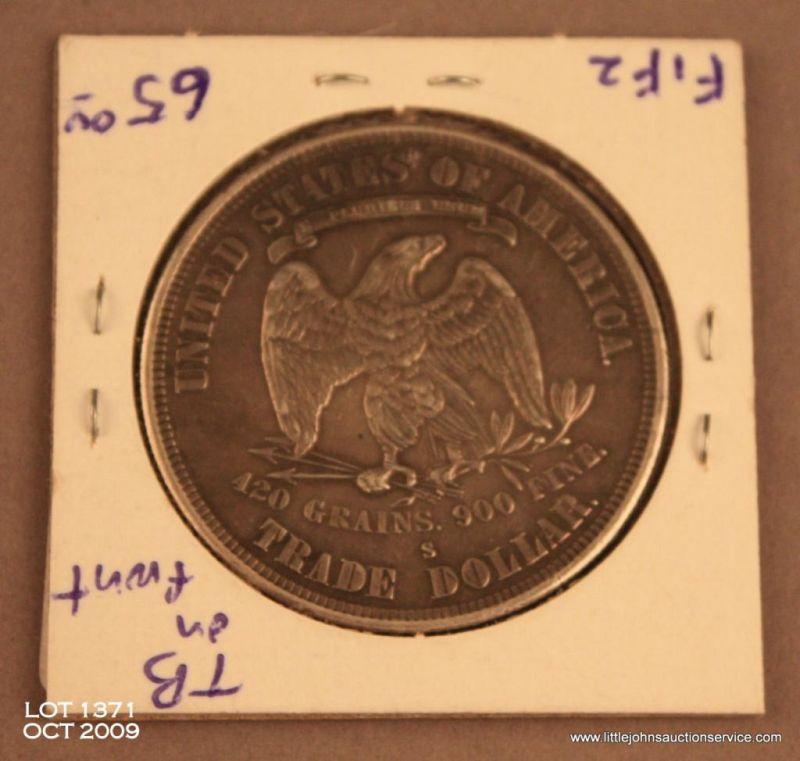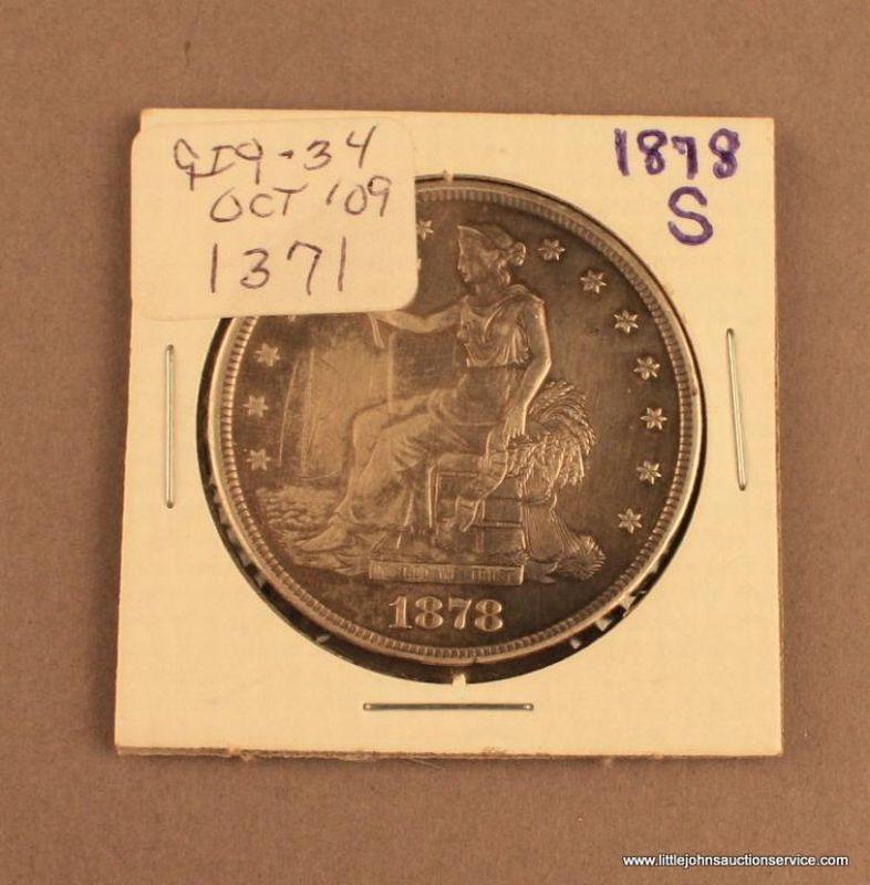 U.S. silver Trade Dollar dated 1878-S in circulated, ungraded overall very good condition with a “TB” scratched on front side before the seated Liberty. Est.: $100-$300.