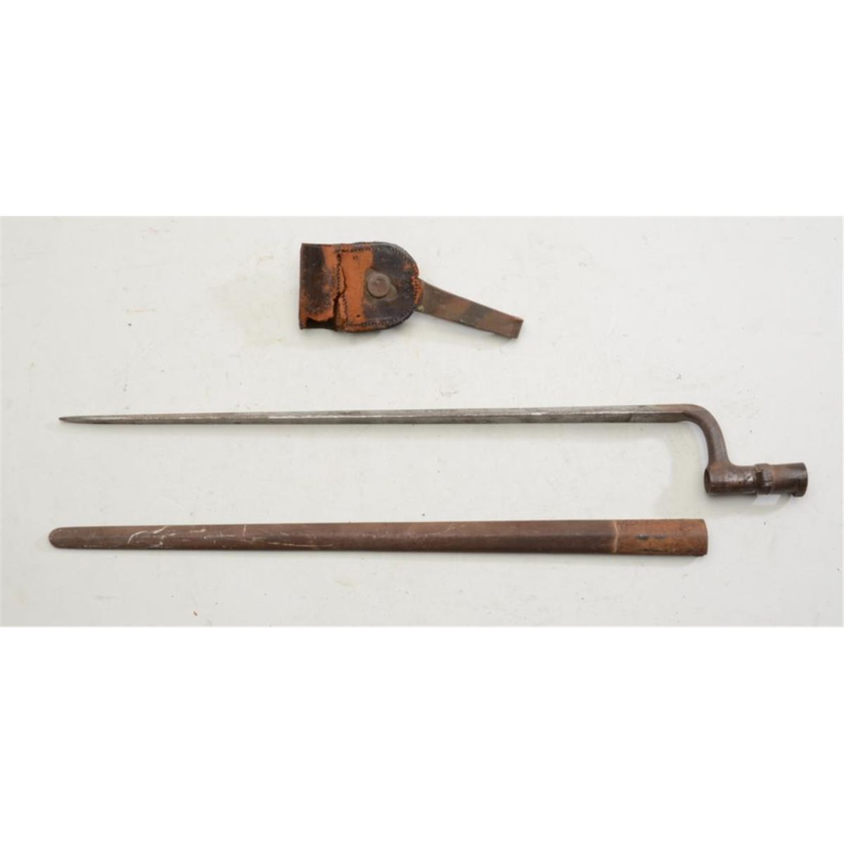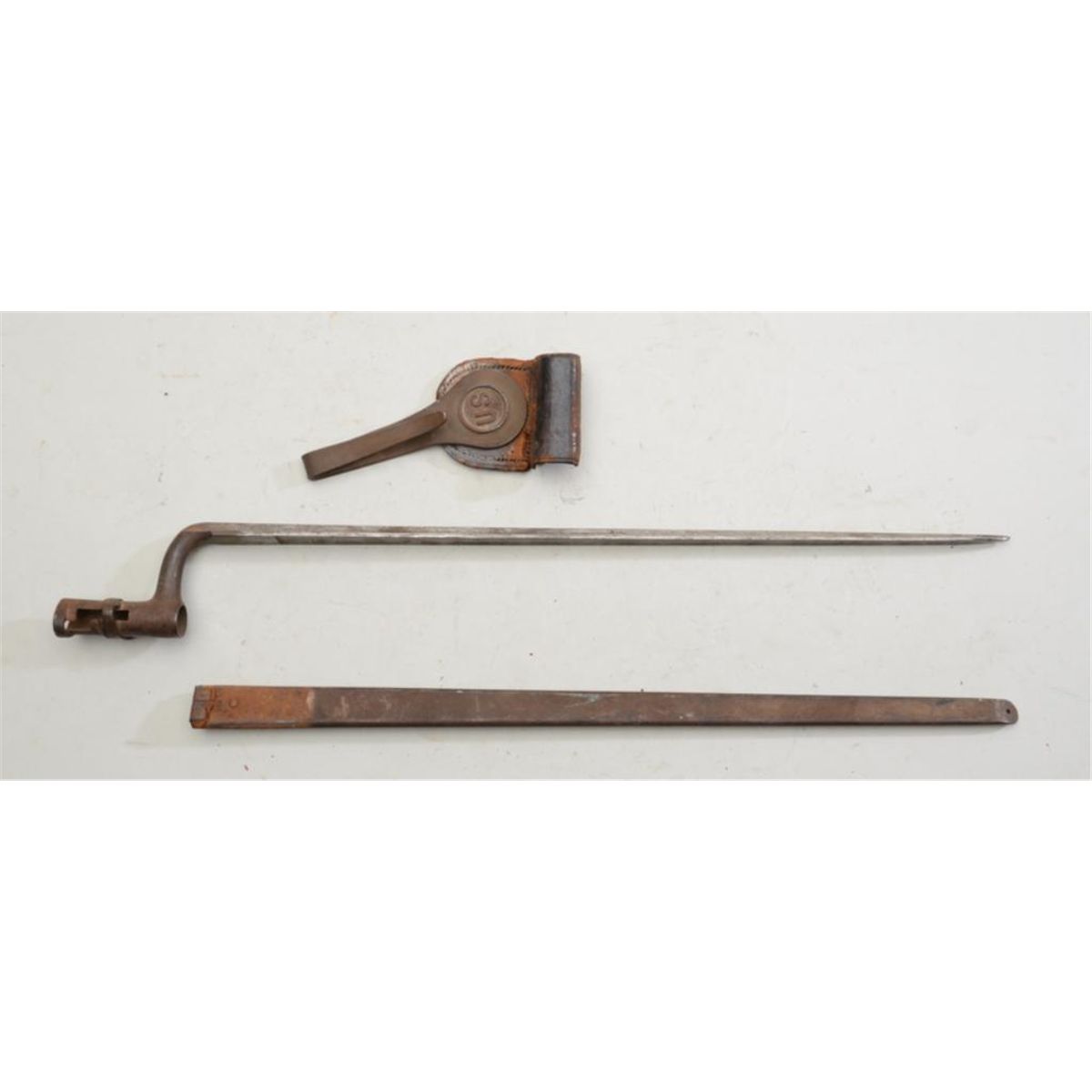 U.S. socket bayonet and metal scabbard with separated hanger and leather fob in near relic condition. Est.: $25-$50.