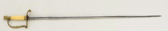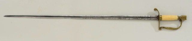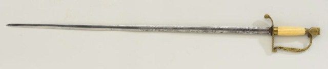 U.S. variant artillery style officer’s sword, circa 1821-1853 with straight thin blade and shield pommel. The sword shows a fluted bone grip and a king’s head Solingen makers mark. The blade is etched with florals, stand ofarms and Indian head; condition is good to very good with normal aging and minor imperfections; no scabbard. Est.: $250-$500.