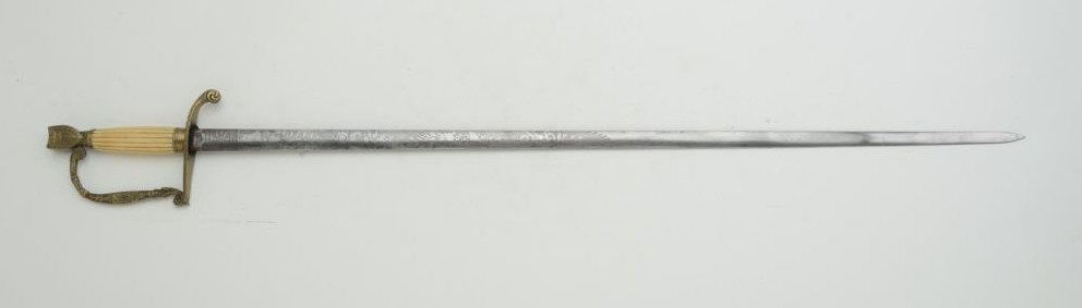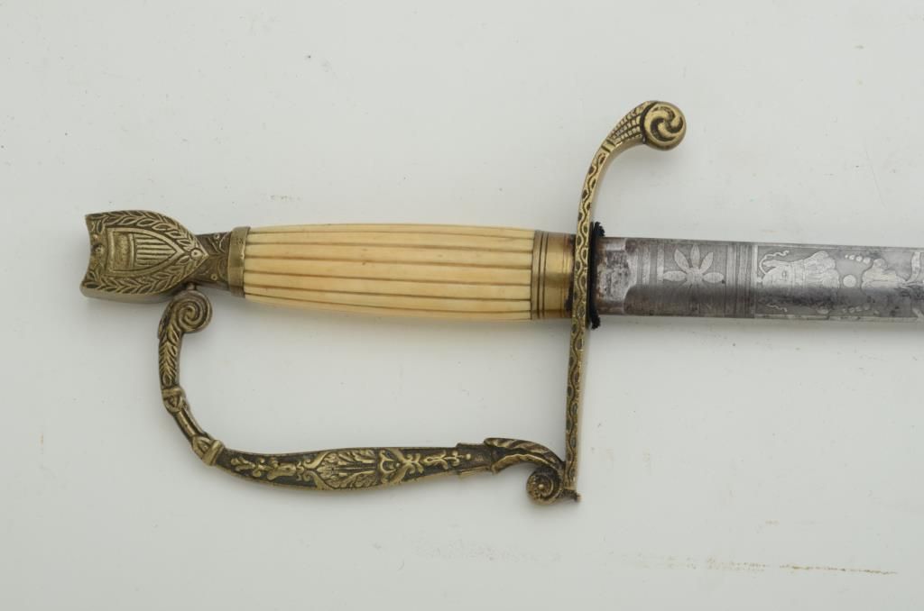 U.S. variant artillery style officer’s sword, circa 1821-1853 with straight thin blade and shield pommel. The sword shows a fluted bone grip and a king’s head Solingen makers mark. The blade is etched with florals, stand ofarms and Indian head; condition is good to very good with normal aging and minor imperfections; no scabbard. Est.: $250-$500.