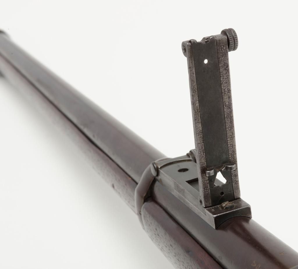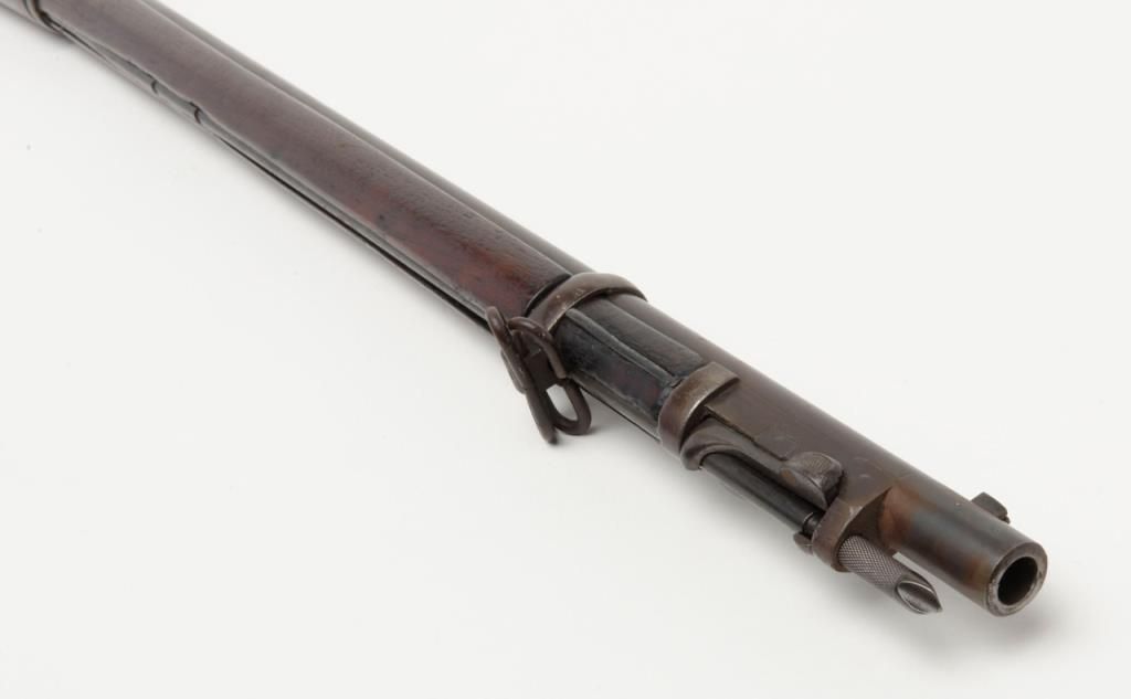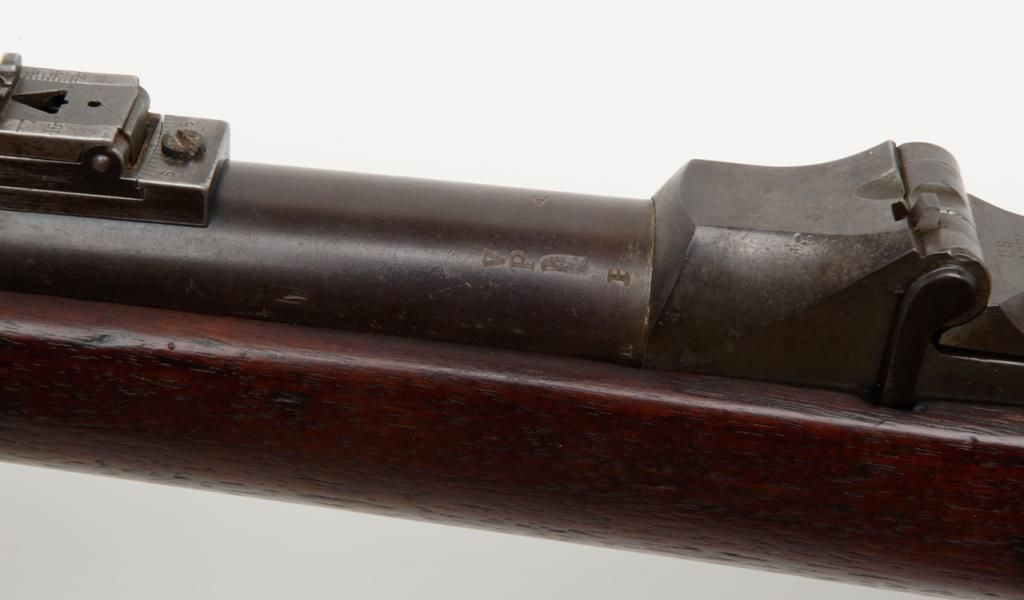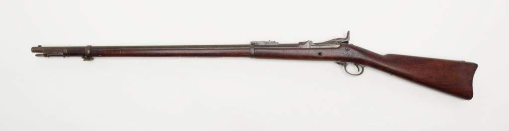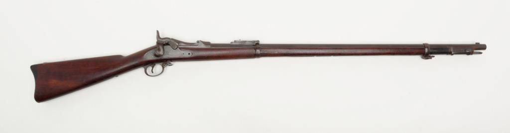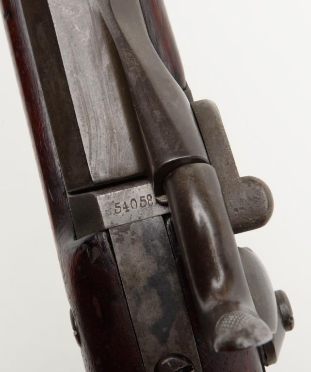 U. Springfield Model 1888 Trapdoor “Ramrod Bayonet” rifle, .45-70 cal., 33” round barrel, blue and case hardened finish, wood stock, sling swivels, ramrod bayonet, wood stock, #540586 in overall very good condition showing a brown patina to the barrel and traces of muted case color on the receiver, good bore, crisp action, very good markings including “32” and “39” stamped on the top of the butt plate below the “US”; very good wood with remnants of circle P proof behindtrigger guard; no inspector’s cartouche visible; some minor scattered old dings and mars from carry and storage; minor oil staining around top of butt plate. A key Model for the Martial collector as this was the last of the blackpowder U.S.trapdoor single shot big caliber longarms in the Springfield series; per Flayderman’s, approx. 65,000 produced. (Antique). Est.: $700-$1,400.