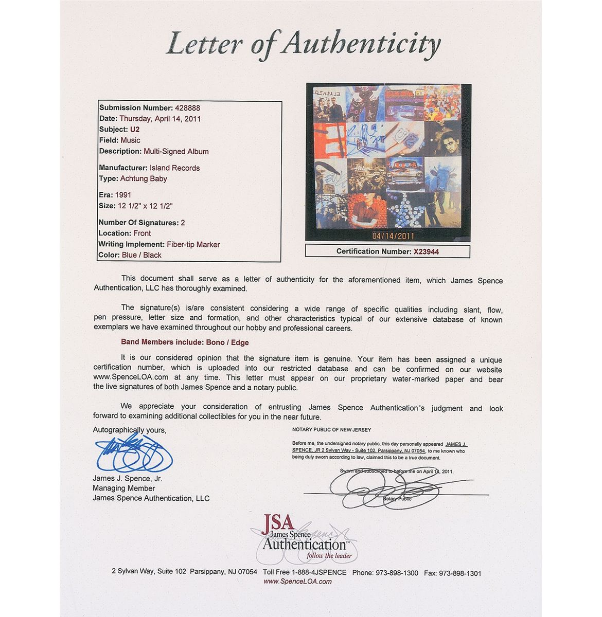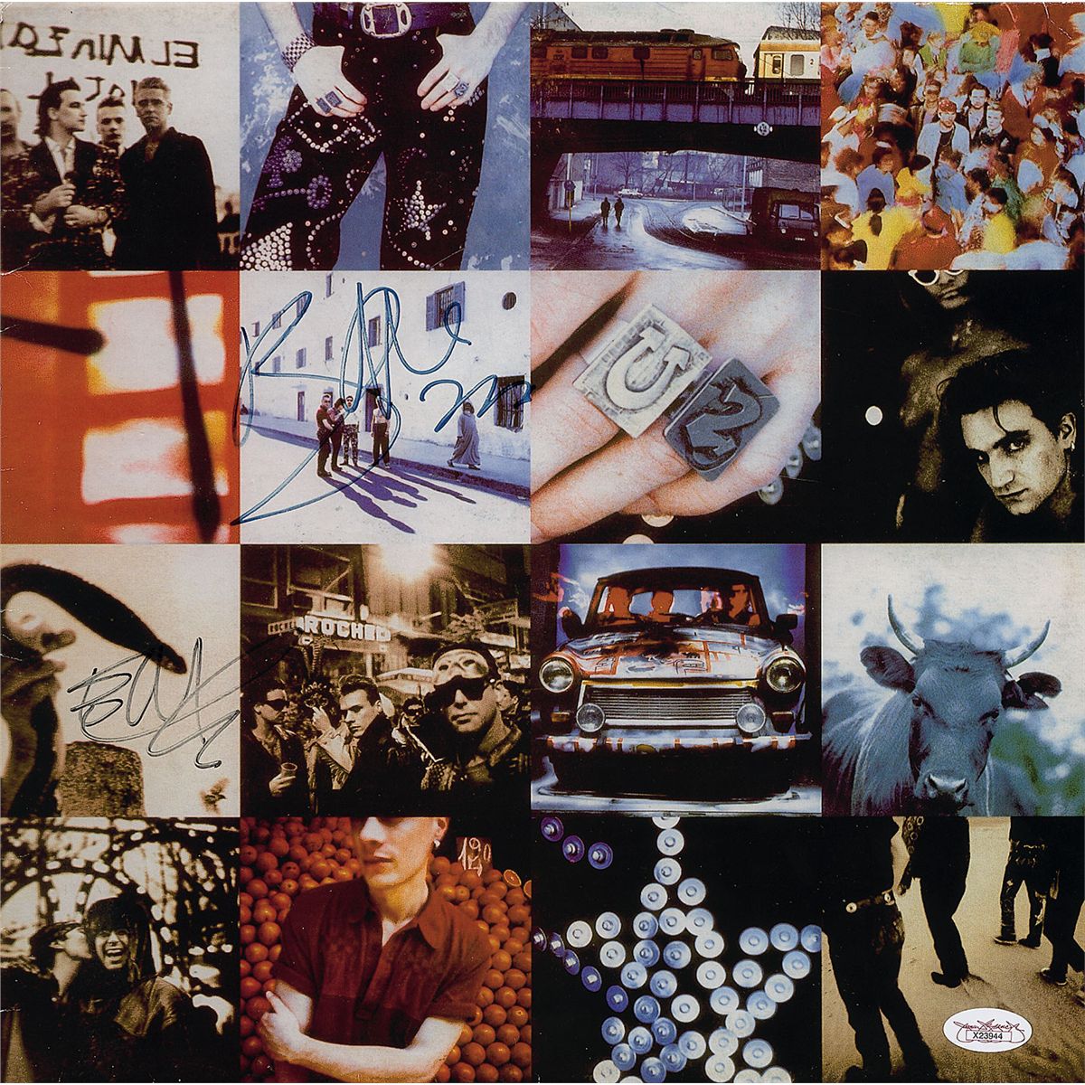 Achtung Baby album signed on the front cover in black felt tip by Bono and Edge. In fine condition, with some scattered light edge creases and a James Spence authentication label affixed to lower corner. The record is not included. Accompanied by a full letter of authenticity from James Spence.