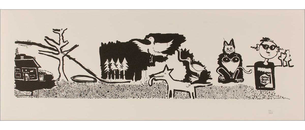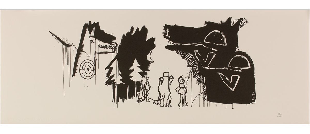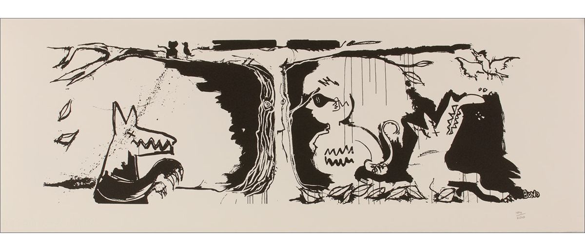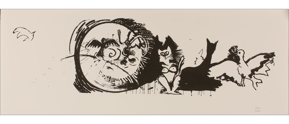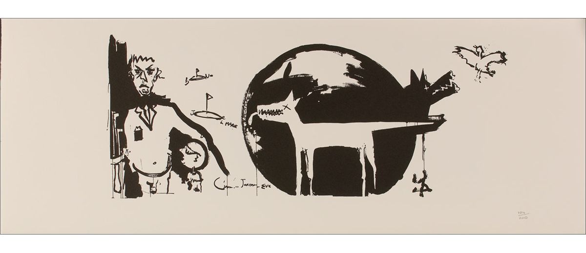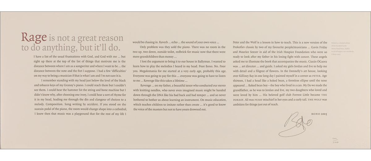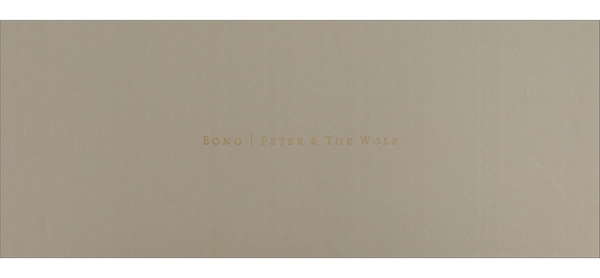 Limited edition boxed set of Peter and the Wolf lithographs, #104/200. This set contains five images of the Peter & The Wolf paintings, and an introductory text signed in pencil by Bono, with each measuring 30 x 11. The set is presented in a cloth-covered presentation box and is accompanied by a copy of the book for which these images were originally created. In fine condition. A beautifully presented set which retails for around $5000.