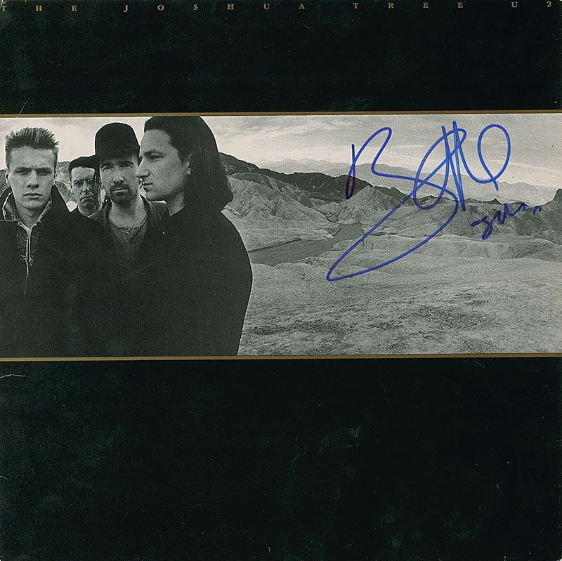 The Joshua Tree album signed on the front in blue felt tip, “Bono 2012.” In fine condition, with a few light edge creases and dings. The record is included.