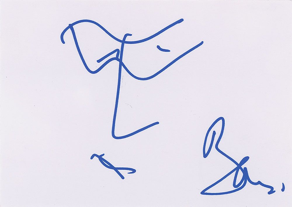 Original signed felt tip self-portrait of Bono in his ‘Fly’ glasses on a white 6 x 4.25 card. In very fine condition.