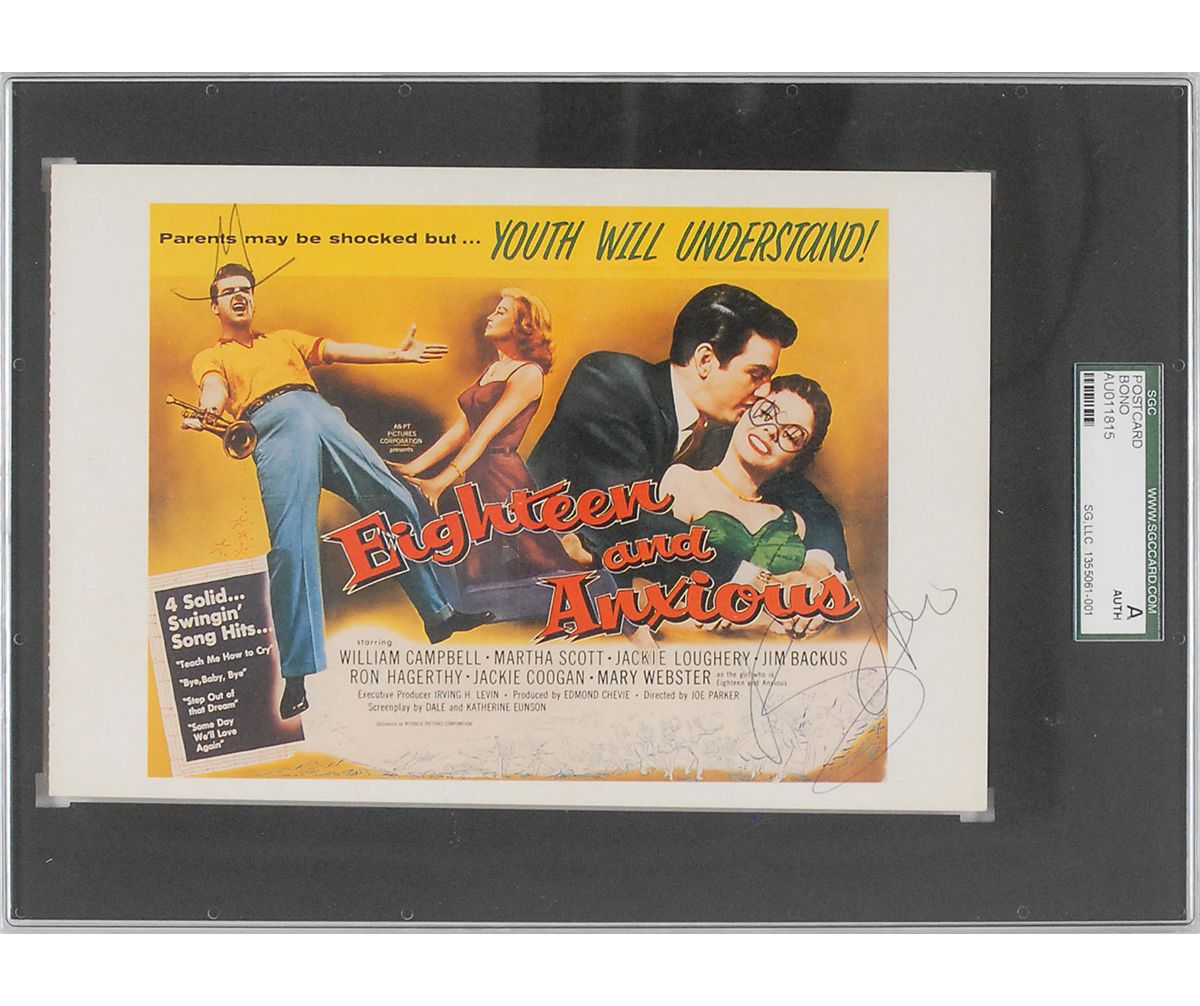 Color 8 x 5.5 promotional postcard for the Republic Pictures film Eighteen and Anxious, signed in ballpoint by Bono, who has sketched a hat on the head of one of the characters on the card and a pair of sunglasses on another. Encapsulated in a plastic SGC authentication holder. In fine condition. Consignor indicates that the signature was obtained in an art shop in Toronto during the band’s PopMart tour.
