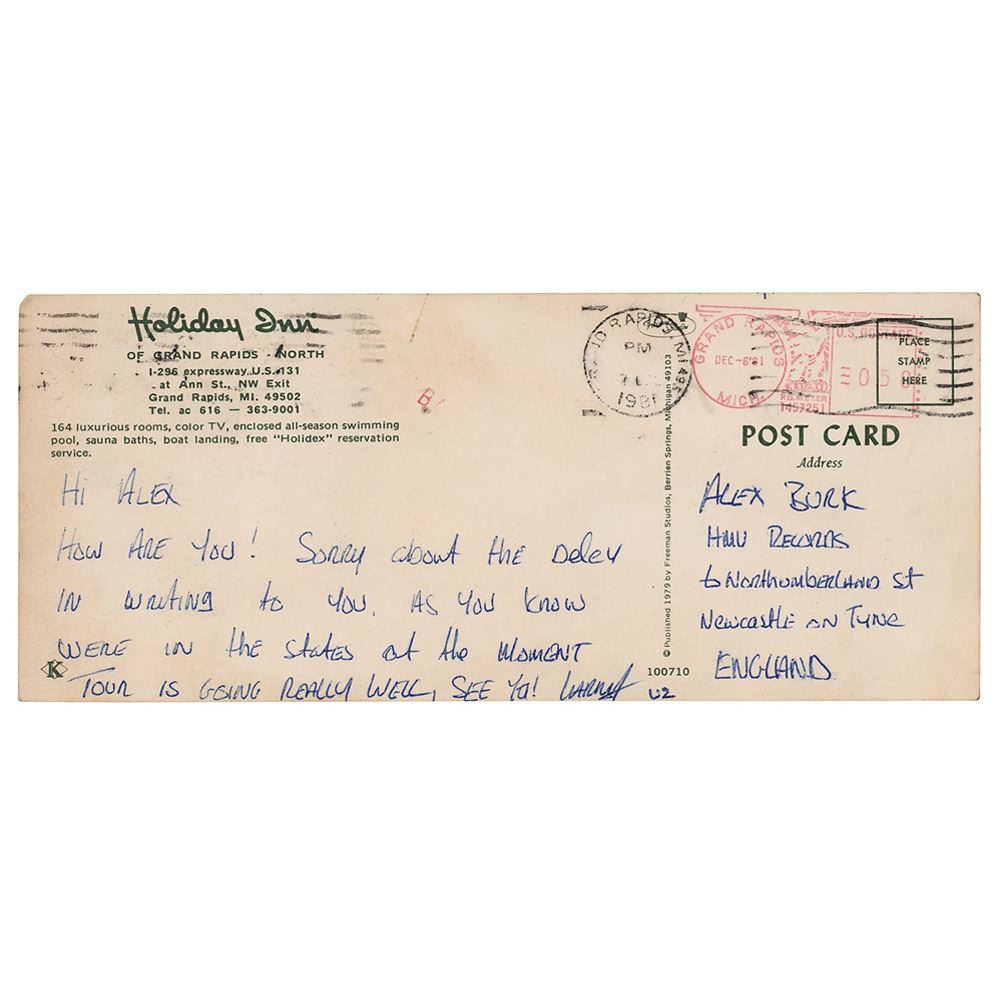 ALS signed “Larry, U2,” penned on the reverse of a color glossy 8.25 x 3.5 postcard of the Holiday Inn in Grand Rapids, Michigan, postmarked on December 6, 1981, when the band were in Grand Rapids to perform a small gig at Dooley’s in East Lancing, Michigan, as part of their October tour. Brief handwritten letter to Alex Burk of HMV Records, in full: "How are you! Sorry about the delay in writing to you. As you know we're in the states at the moment. Tour is going really well, see ya!" In fine condition, with one unobtrusive tack hole in a blank area. Accompanied by a certificate of authenticity from Tracks.