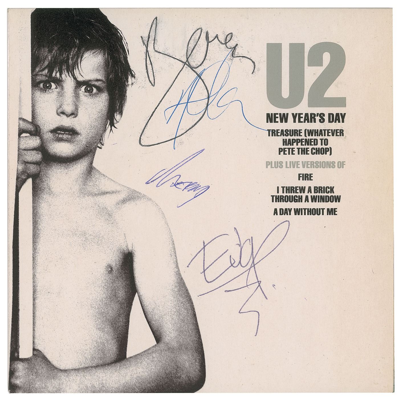 Island Records 45 RPM for the U2 EP 'New Year's Day / Treasure (Whatever Happened to Pete the Chop),' signed on the front cover in black ballpoint, "Edge," in black ink, "Bono," and in blue ballpoint, "Adam" and "Clayton." In fine condition, with light brushing to Bono's signature. The record is not included.