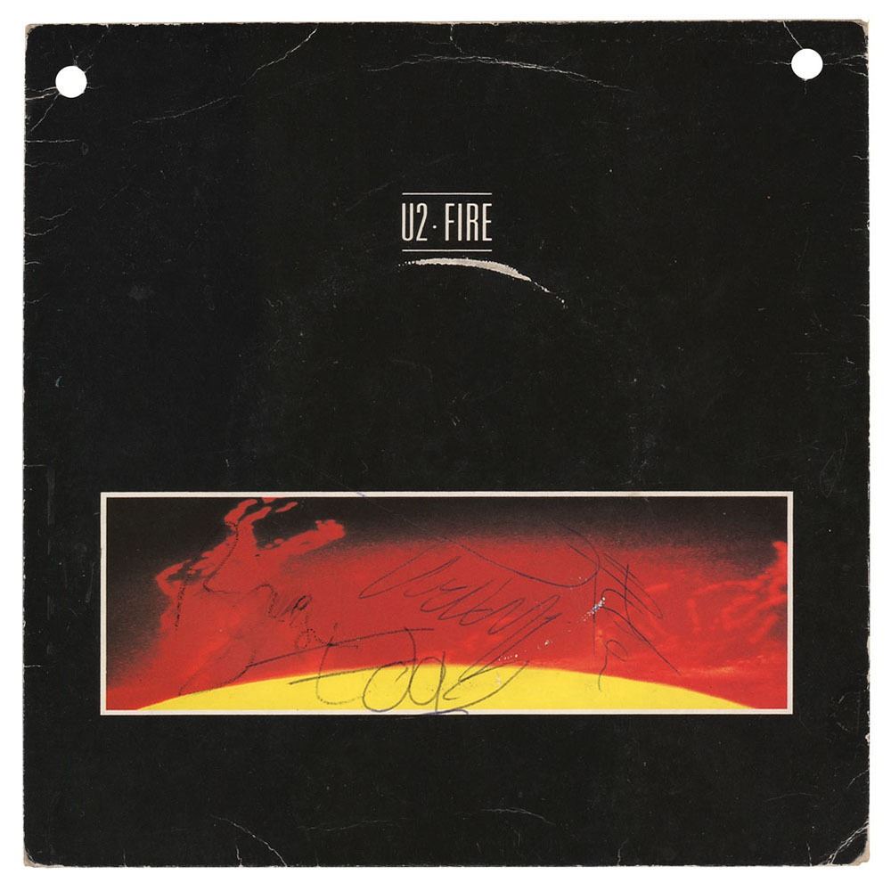 Island Records 45 RPM single for 'Fire / J. Swallo' by U2, signed on the front cover in black ink and ballpoint by Bono, Edge, Larry Mullen, Jr., and Adam Clayton. In very good to fine condition, with edge creasing, two punch holes, and Bono's signature partly missing due to very poor ink adhesion. The record is not included.