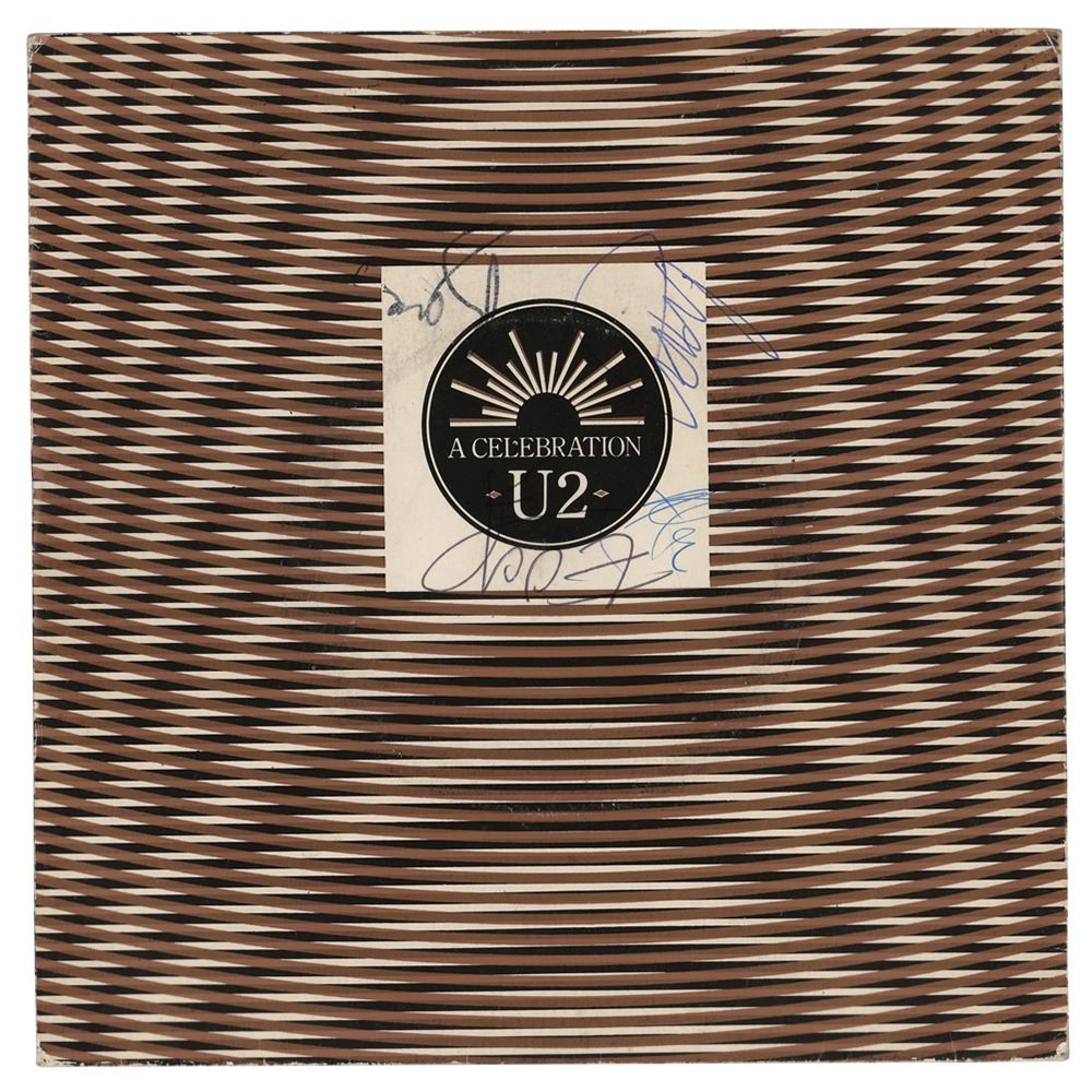 Island Records 45 RPM single for 'A Celebration / Trash, Trampoline and the Party Girl' by U2, signed on the front cover in black ink by Bono, in black ballpoint by Edge, and in blue ballpoint by Adam Clayton and Larry Mullen, Jr. In fine condition. The record is included.