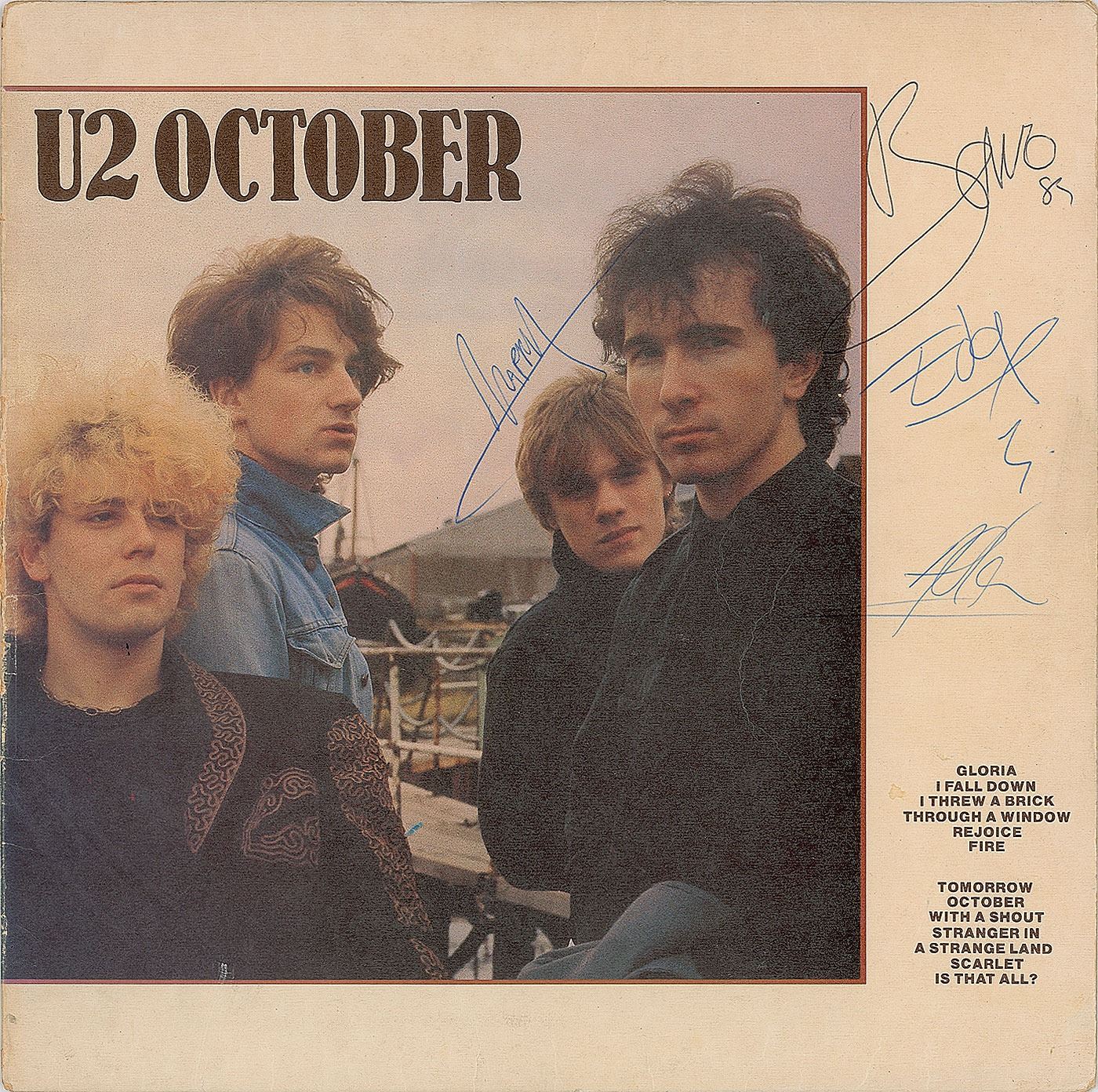 October album signed on the front cover in blue ballpoint, "Larry," "Edge," and "Adam," and in black ballpoint, "Bono, 83." In fine condition, with wear and partial separation to the left edge. The record is not included. A very desirable, fully signed example.