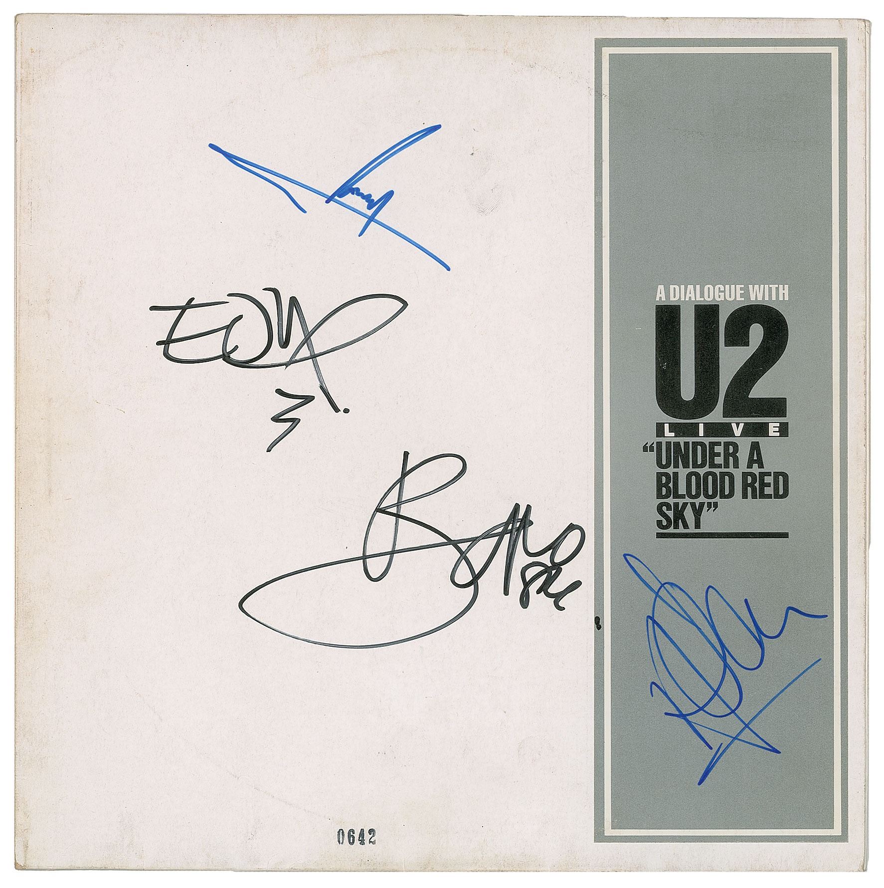 Uncommon A Dialogue with U2 Live, 'Under a Blood Red Sky' album signed on the front cover in black felt tip, "Bono, 84" and "Edge," and in blue felt tip, "Larry" and "Adam." In fine condition, with light scuffing and soiling. The record is included.