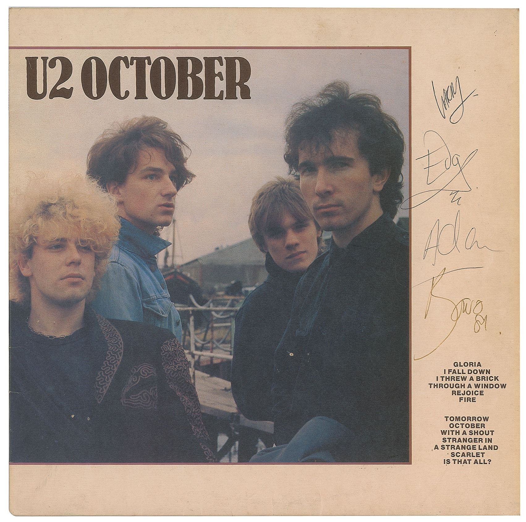 Very desirable October album signed on the front cover in black ink, "Bono, 81," and in black ballpoint, "Larry," "Edge," and "Adam." In fine condition. The record is not included. Accompanied by a full letter of authenticity from REAL. A perfect set of late 1981 signatures.