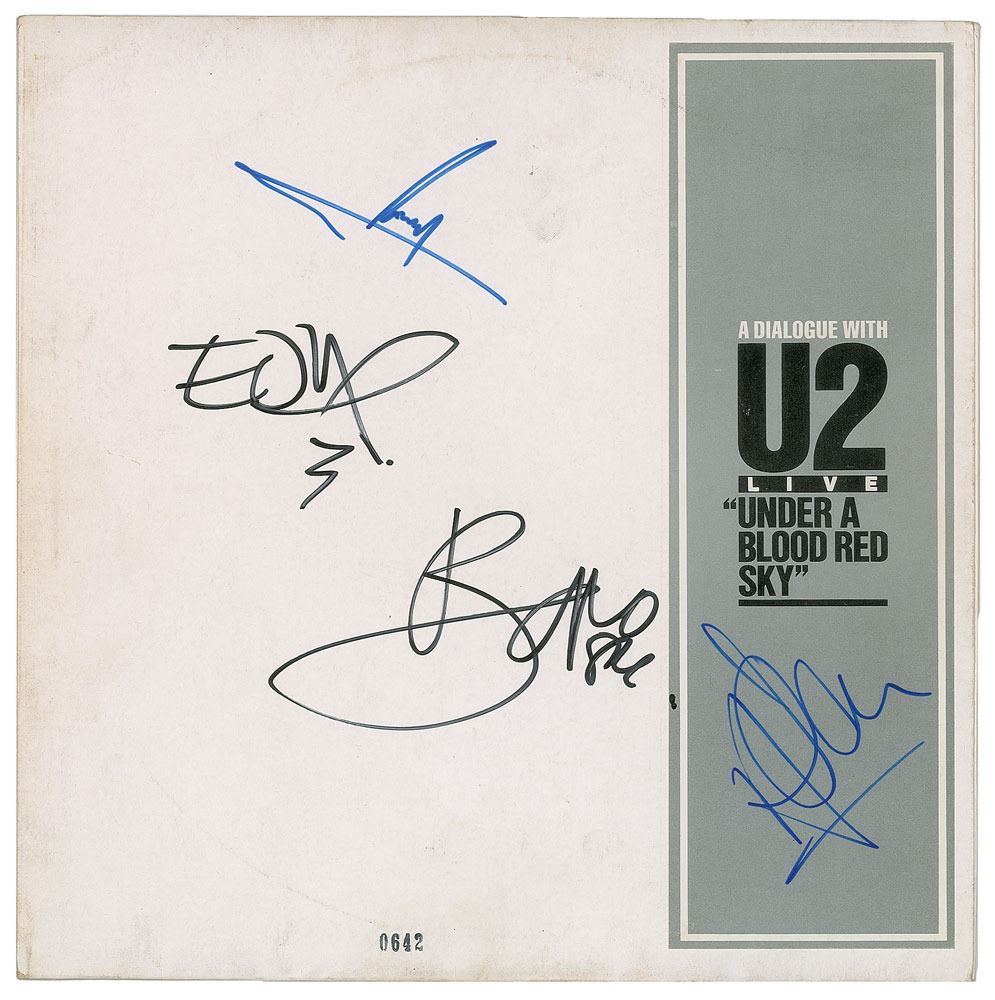 Limited edition U2 album entitled A Dialogue with U2 Live, 'Under a Blood Red Sky,' numbered 642 of 1000 issued, signed on the front cover in black felt tip, "Bono, 84" and "Edge," and in blue felt tip, "Larry" and "Adam." In fine condition, with light scuffing and soiling. The record is included. Accompanied by a John Brennan Collection letter of provenance.