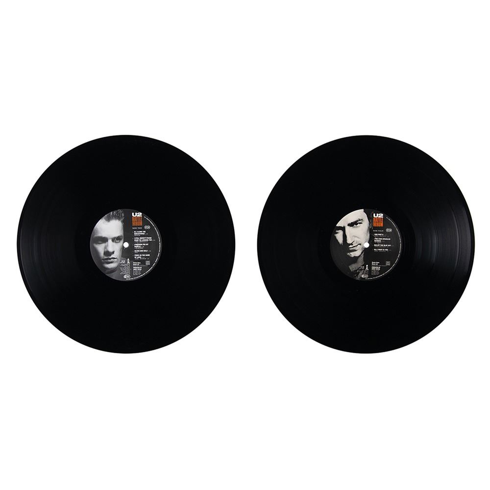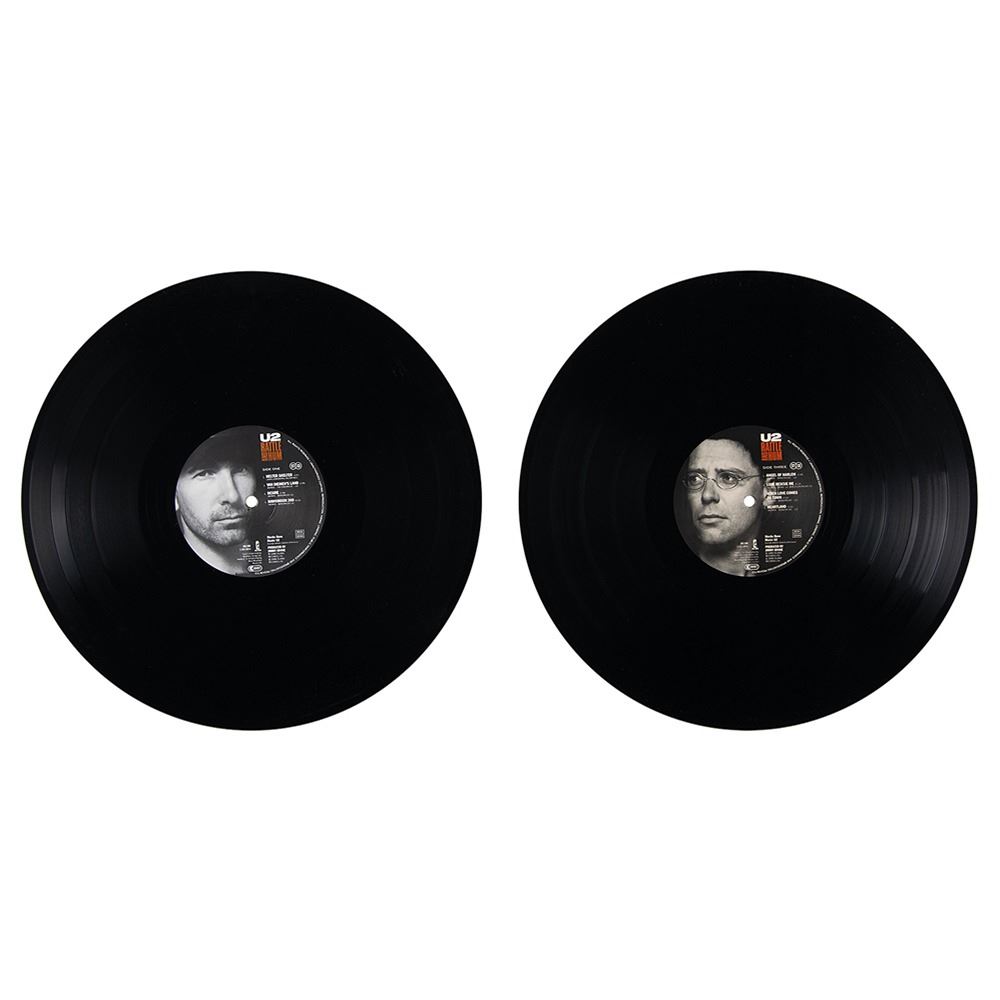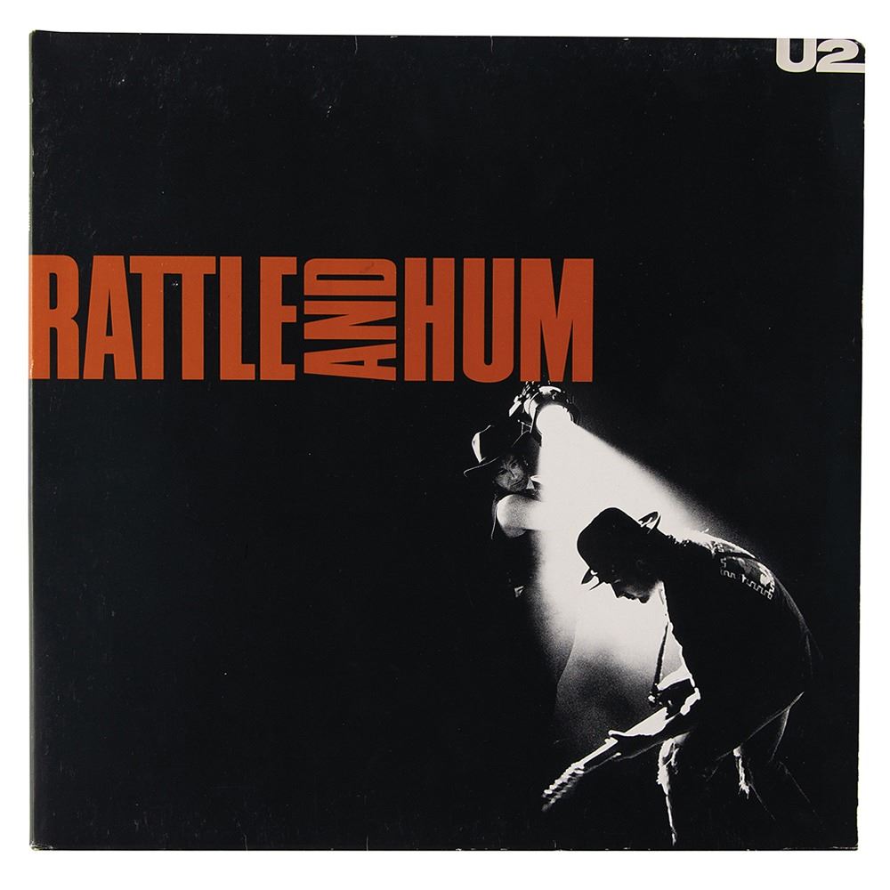 German vinyl pressing of U2’s 1988 album Rattle and Hum, which has been prominently signed and inscribed on the inner gatefold in blue ballpoint, “Bono, VOX POPPED, 89!! 90…,” “To Emyl, Edge,” “Adam,” and “Larry.” The consignor notes that the autographs were obtained at the Amstel Hotel in Amsterdam, Holland, after U2’s performance at the RAI Congress Hall in Amsterdam on December 18, 1989. During the concert, when Bono was singing ‘God Part II,’ he completely lost his voice and had to leave the stage, which ultimately canceled the planned encore with B.B. King; to end the show, the entire crowd sang the Beatles hit ‘HELP!’ in honor on Bono. In order to let Bono’s voice recover, two further shows in Amsterdam were canceled and rescheduled for January 1990 in Rotterdam. In fine to very fine condition. The records are included. Accompanied by a certificate of authenticity from Tracks.