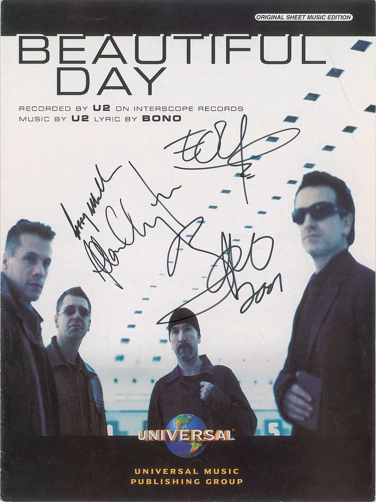 Universal Music lyric and sheet music booklet for the U2 song 'Beautiful Day,' eight pages, 9 x 12, signed on the front cover in black felt tip, "Edge," "Larry Mullen," "Adam Clayton," and "Bono, 2001." In fine condition, with slight marks to borders, in no way affecting the signatures or booklet imagery. Released as the opening track from their 2000 album All That You Can't Leave Behind, 'Beautiful Day' won three Grammy Awards for Song of the Year, Record of the Year, and Best Rock Performance by a Duo or Group with Vocal.