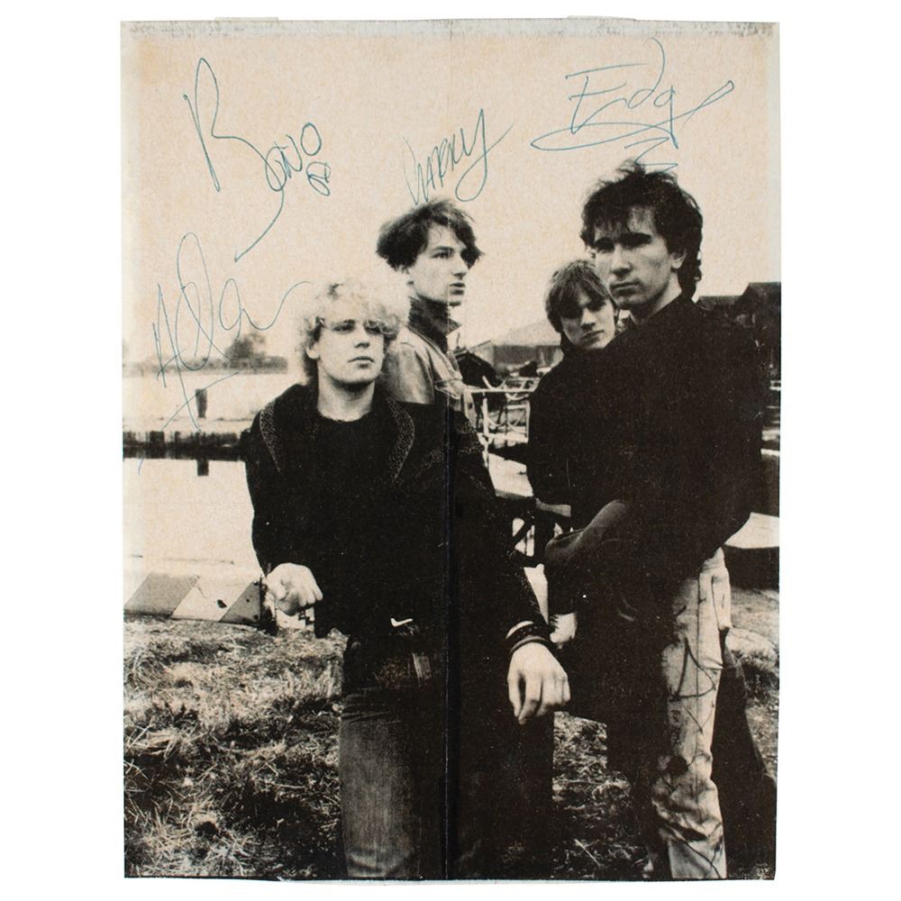 Photo of U2 from early in their career, 5.25 x 7, trimmed from a 1981 magazine page, signed in black ballpoint by Bono, Edge, Adam Clayton, and Larry Mullen, Jr., with each signing first name only. In very good to fine condition, with a central vertical fold, and toning from prior display. The consignor notes that these signatures date to either late 1981 or early 1982.