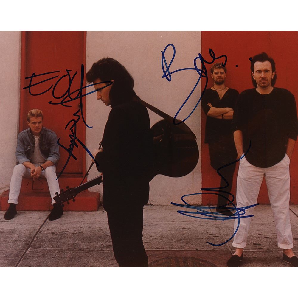 Color glossy 10 x 8 photo of U2, signed in blue felt tip by Bono, Edge, Adam Clayton, and Larry Mullen, Jr. In fine condition.
