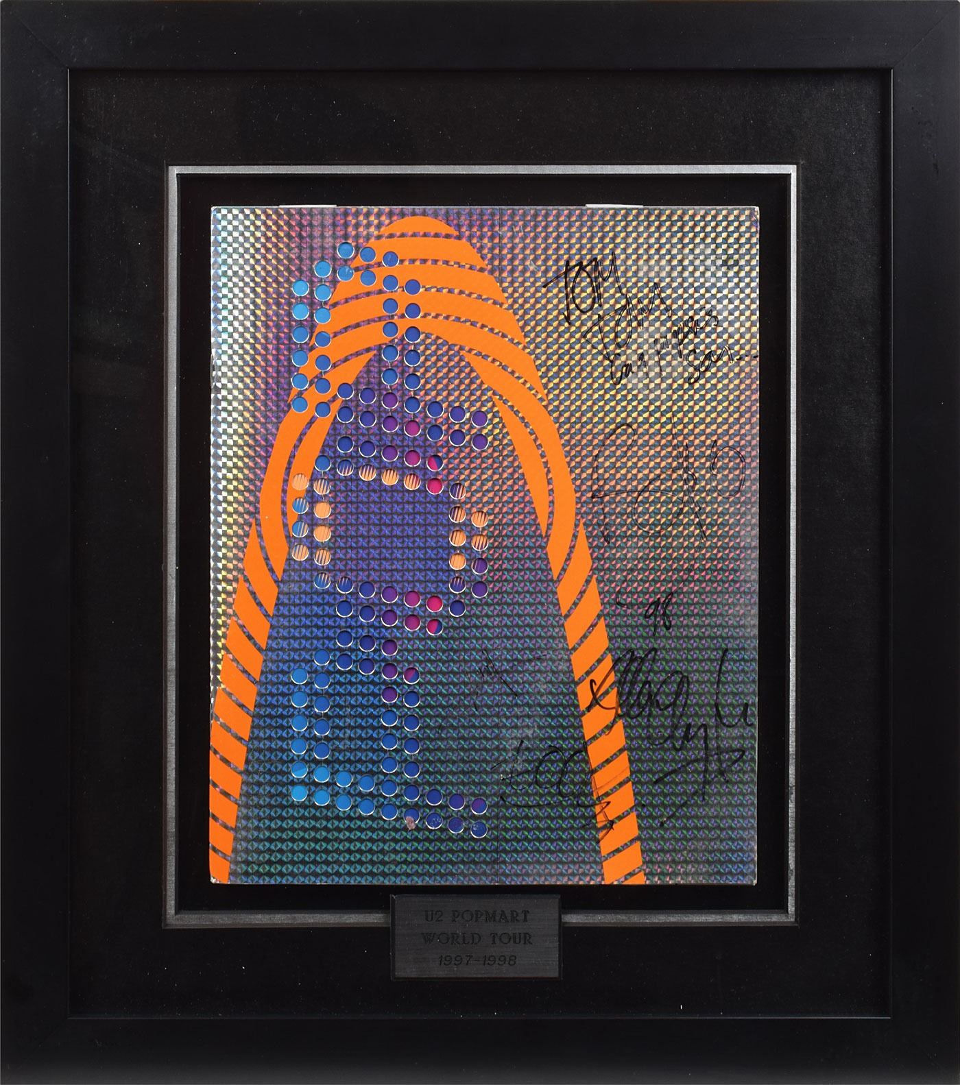 Concert program from the band’s 1997–1998 PopMart tour, 9.75 x 12, signed on the front cover in black felt tip, "Tom, Tom, bagpiper's son...Bono, 98," "Larry," "Edge," and "Adam Clayton." Mounted and framed to an overall size of 17 x 19.25. In fine condition, with rubbing to upper right and some lightness to signatures. 'Tom, Tom, the Piper's Son' is a classic English nursery rhyme, making for an interesting inscription from the U2 frontman. The band’s 1997–1998 tour comprised of five legs and a total of 93 multimedia shows around the world.