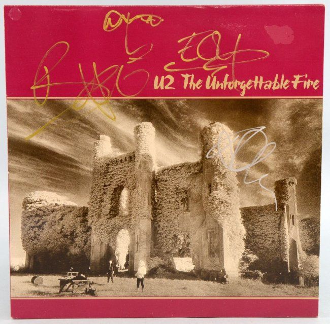 U2 'The Unforgettable Fire' vinyl LP signed to the front cover by 3 members including Bono (with sketch self portrait), The Edge & Adam Clayton Provenance: Autographs were obtained in Madrid, 1993.