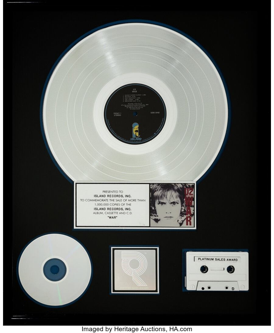 U2WarRIAA R Hologram Platinum Sales Award.  An award presented to the label that released the band's breakthrough third album. According to the plaque in the center portion, "Presented To / Island Records, Inc. / To Commemorate the Sale of More Than / 1,000,000 Copies of the / Island Records, Inc. / Album, Cassette and C.D. / ‘War'." Measures 17" x 21". In Very Good Plus condition with chipping and scratches on the frame. COA from Heritage Auctions.