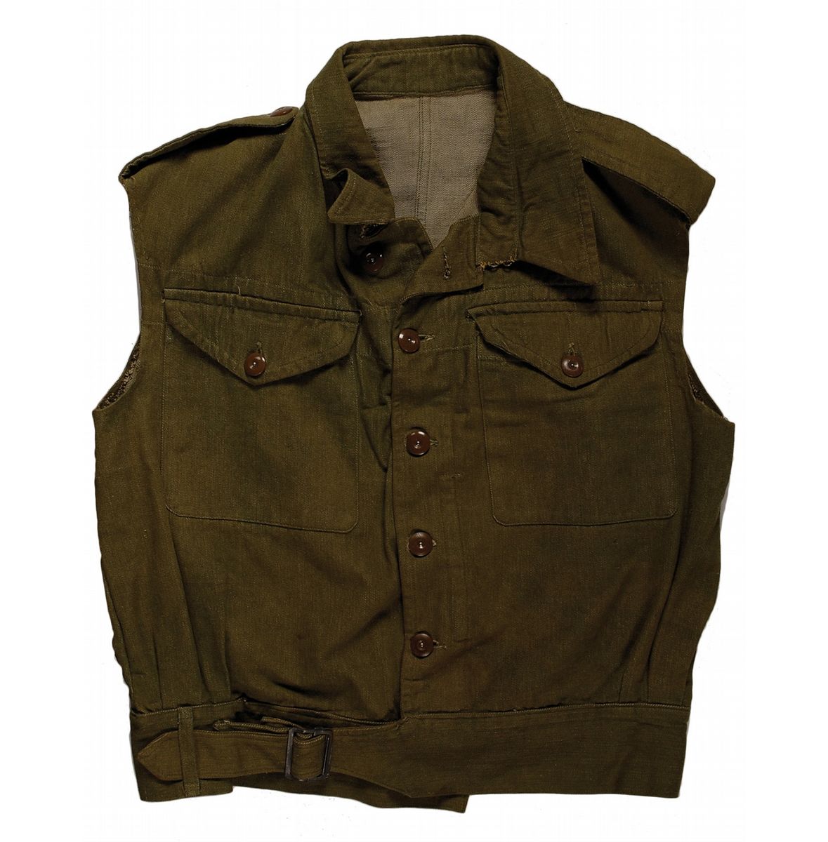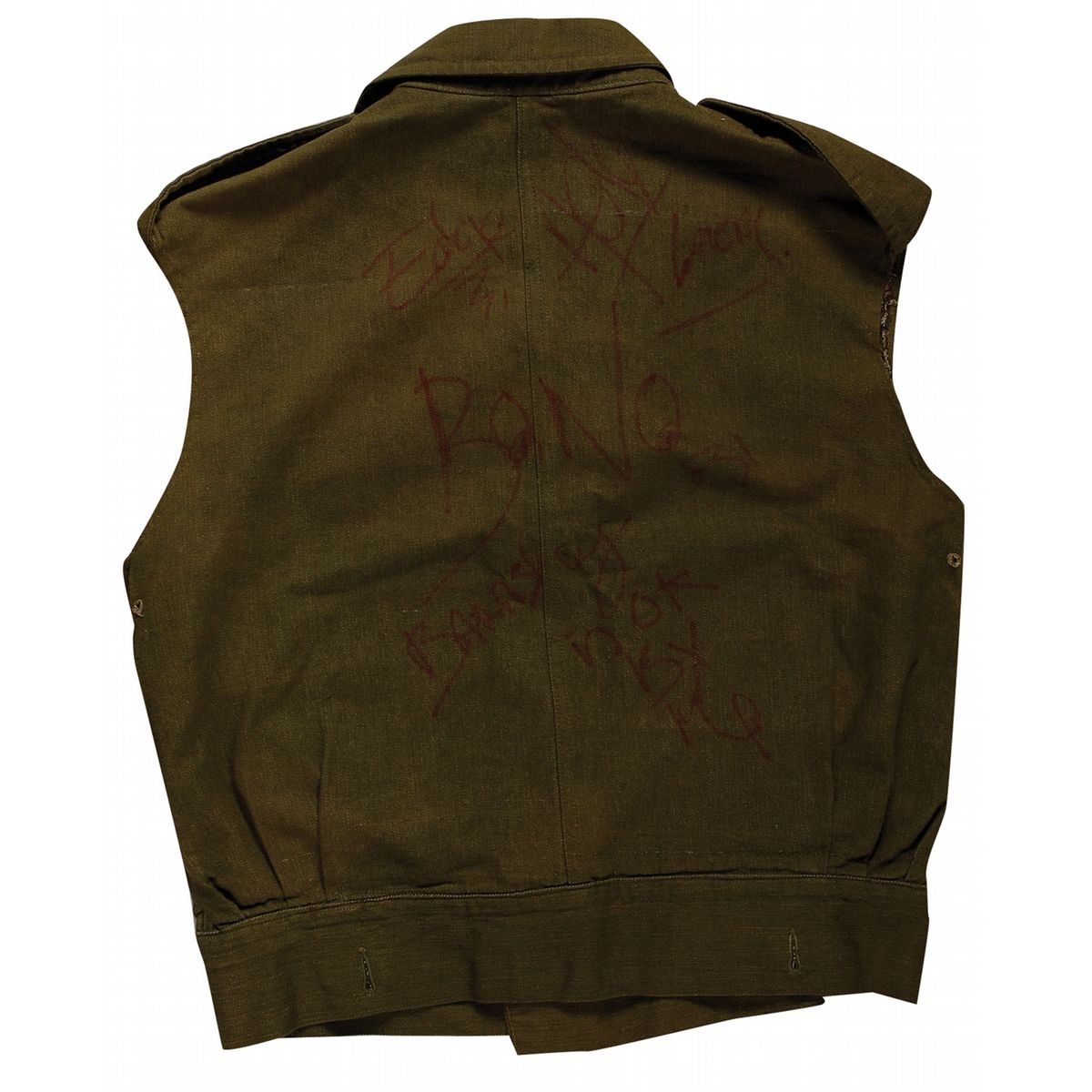 Green canvas vest, featuring a button front, two pockets, and a waist strap, signed on the reverse in red felt tip, “Edge,” “Larry,” “Adam,” and “Bono 83,” adding “Barasley not for me.” In fine condition, with all signatures a shade or two light, but still completely legible. An exceptionally early set of large signatures obtained as the band was supporting their first gold record, War, featuring their iconic song, ‘Sunday Bloody Sunday.’