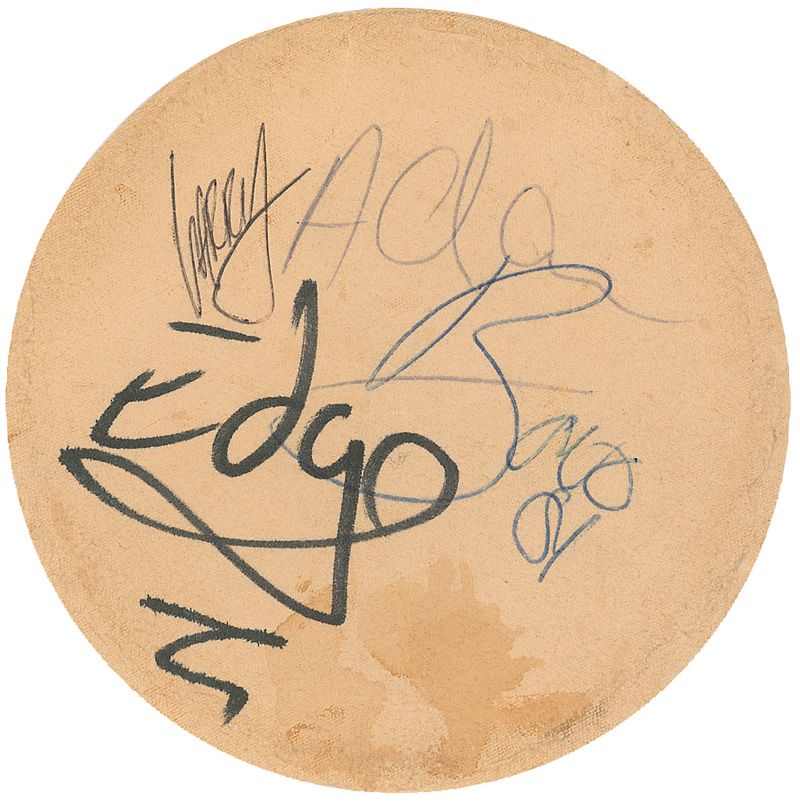 Very early ballpoint signatures, “Bono 81,” “Larry,” and “Adam,” and a felt tip signature, “Edge,” on a 4.75? diameter piece of off-white circular cardstock. In very good to fine condition, with light staining along bottom, lightly affecting Edge’s signature, and scattered light creases and toning.