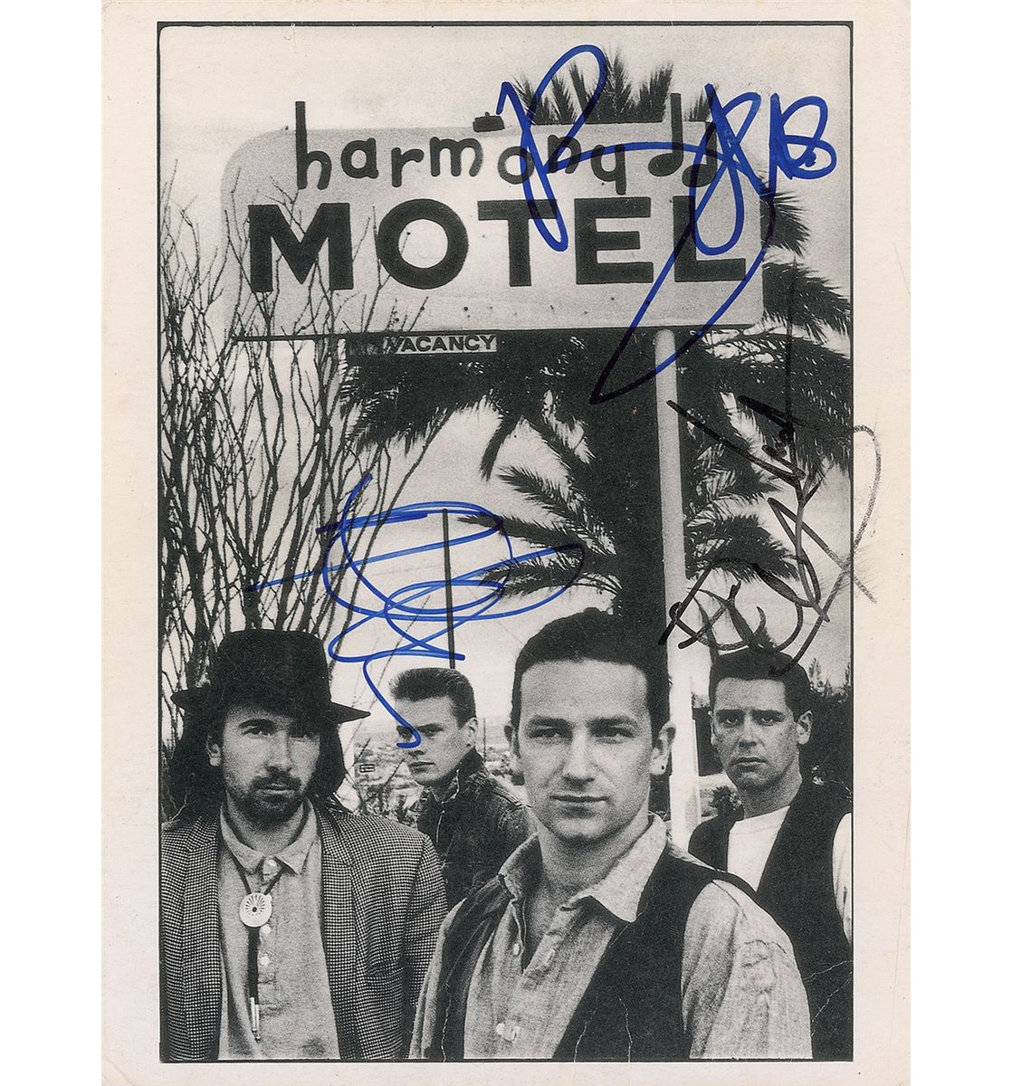 Scarce 7.25 x 9.75 cardstock publicity photo from the 1987 Joshua Tree tour, signed in-person in blue and black felt tip, “Bono,” “Edge,” “Adam,” and “Larry.” Scattered creases and a slight brush to Edge’s signature, otherwise fine condition. Originally obtained by in-person specialist Mike Wehrmann.