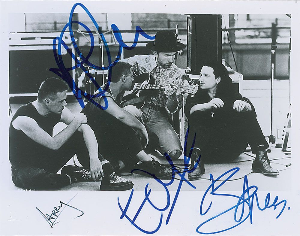 Superb glossy 10 x 8 photo of the group in their younger days, signed in blue and black felt tip by Bono, The Edge, Adam Clayton, and Larry Mullen. In very fine condition.