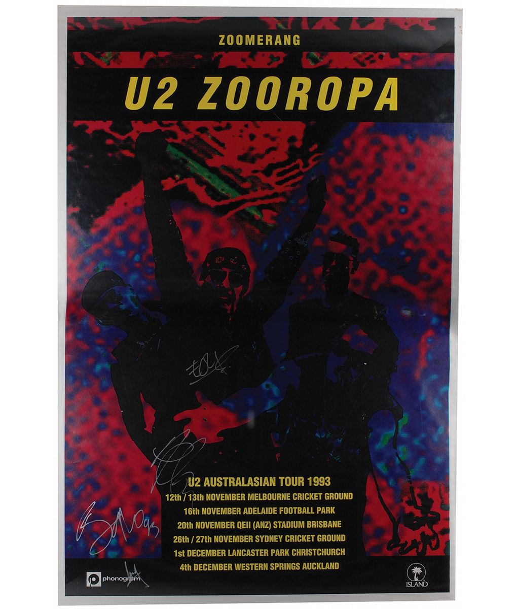 Color 42 x 61 poster entitled for their 1993 Zooropa Australasian tour, signed in silver ink by Bono, Edge, Larry Mullen, and Adam Clayton, all signing first names only. Rolled and in fine condition, with a few scattered creases.