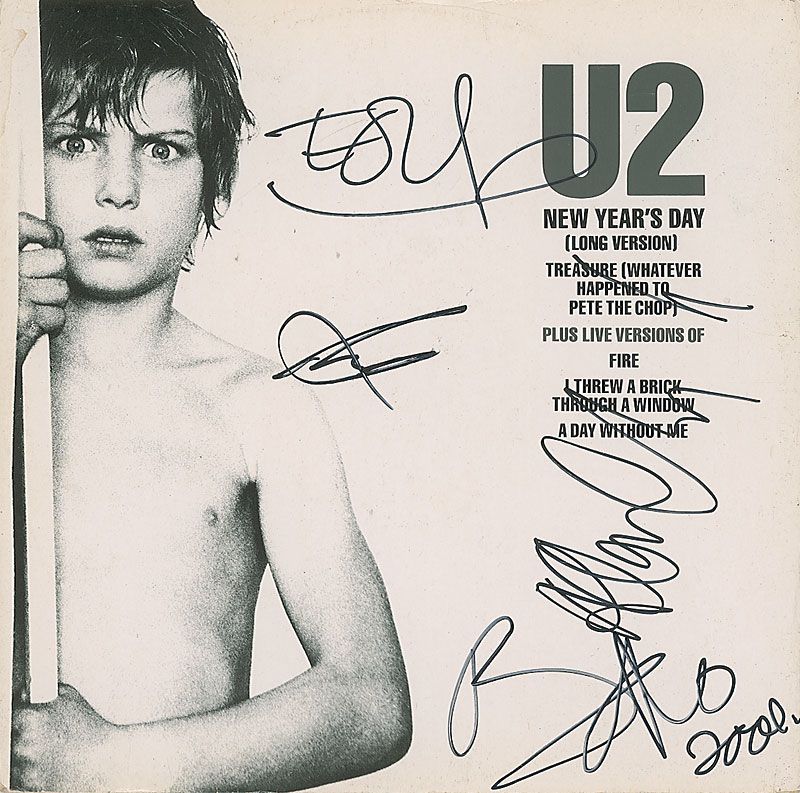 New Year’s Day album signed on the front of the sleeve in black felt tip by Bono, The Edge, Adam Clayton, and Larry Mullen. In fine condition. The record is included. Accompanied by a full letter of authenticity from JSA. Consignor notes that this was signed in London on November 2, 2000, when the band was appearing on Virgin Radio.
