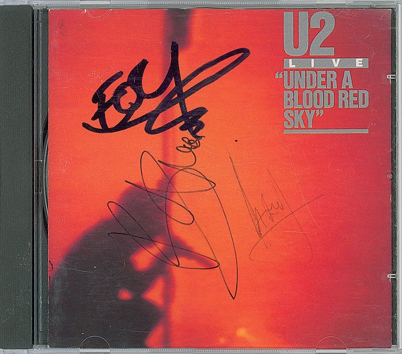 Under a Blood Red Sky CD signed on the front of the booklet in felt tip and ballpoint by Bono, Edge, and Larry Mullen. In fine condition. The CD is included.