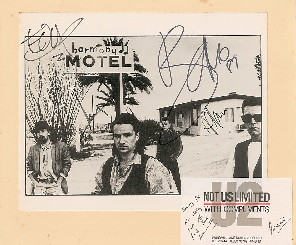 Cardstock 10 x 8 group photo, signed in black felt tip “Bono, 87” “Edge,” “Larry,” and “Adam.” Photo is affixed to a 12 x 10 scrapbook page, which is in turn affixed to a 12.5 x 10.5 off-white board. A small note on U2 letterhead is affixed to the lower right, which reads, “Sorry for the delay but the band has been on tour.” In fine condition.