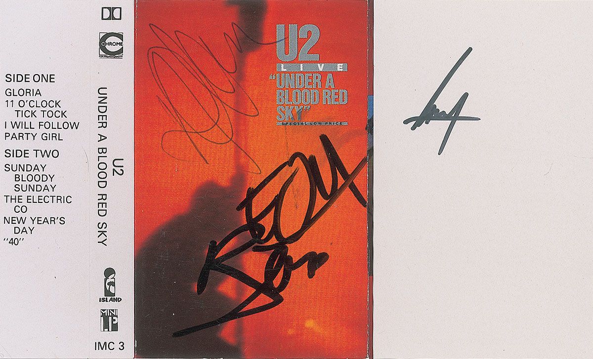 Cassette cover for Live ‘Under a Blood Red Sky,’ 6.5 x 4 unfolded, signed in black felt tip, “Bono,” “Edge,” and “Larry,” and in black ballpoint, “Adam.” In fine condition.