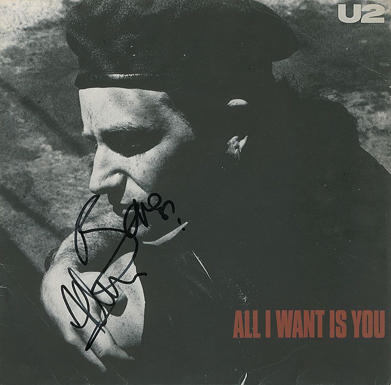 ‘All I Want Is You’ album signed on the front cover in black felt tip by Bono and Adam Clayton. Scattered creases, otherwise fine condition. The record is not included. Accompanied by a full letter of authenticity from Roger Epperson/REAL.