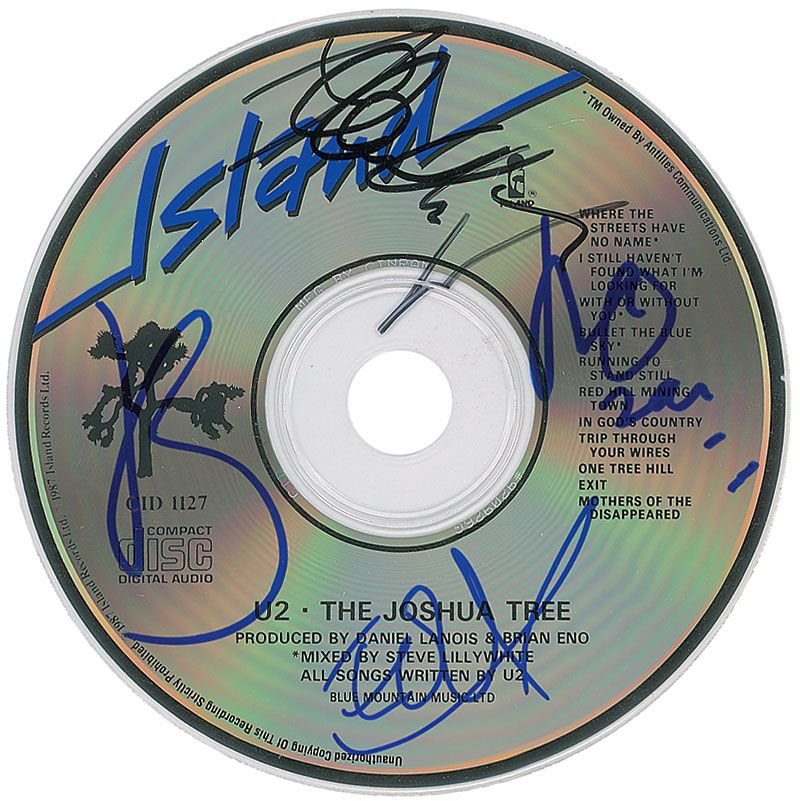The Joshua Tree CD signed on the disc in blue and black felt tip by Bono (using the center circle of the disc as the first ‘o’), Edge, and Adam Clayton. In fine condition.