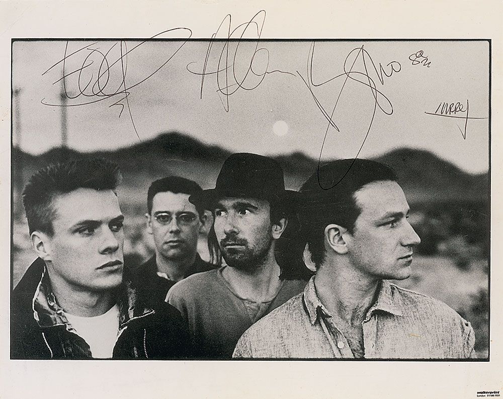Rare 10 x 8 cardstock publicity photo of the band originally photographed for their 1987 album The Joshua Tree, signed in black ballpoint, “Bono 89,” “Edge,” “Adam Clayton,” and “Larry.” A few creases, otherwise fine condition. Widely considered the band’s best album, The Joshua Tree featured modern classics such as ‘With or Without You,’ ‘I Still Haven't Found What I'm Looking For,’ and ‘Where the Streets Have No Name’—a superb photo from the band in their prime.