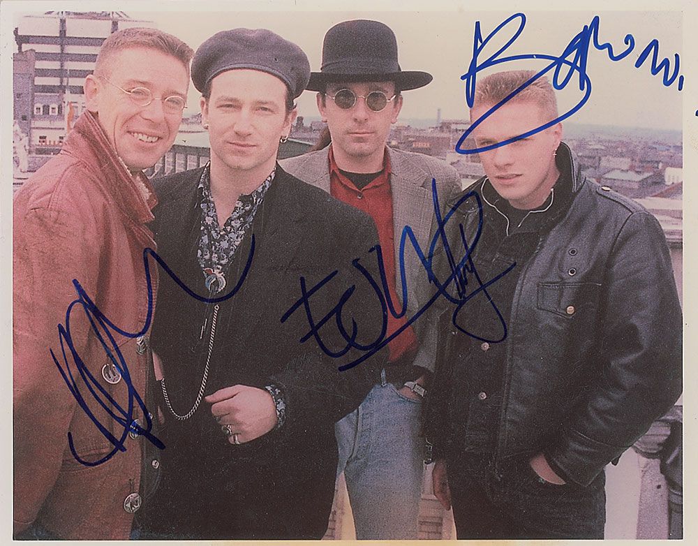 Color glossy 10 x 8 photo of the band posing on a roof top, signed in person in blue felt tip by Bono, Edge, Adam [Clayton], and Larry [Mullen, Jr]. In fine condition. Originally obtained by in-person specialist Mike Wehrmann.