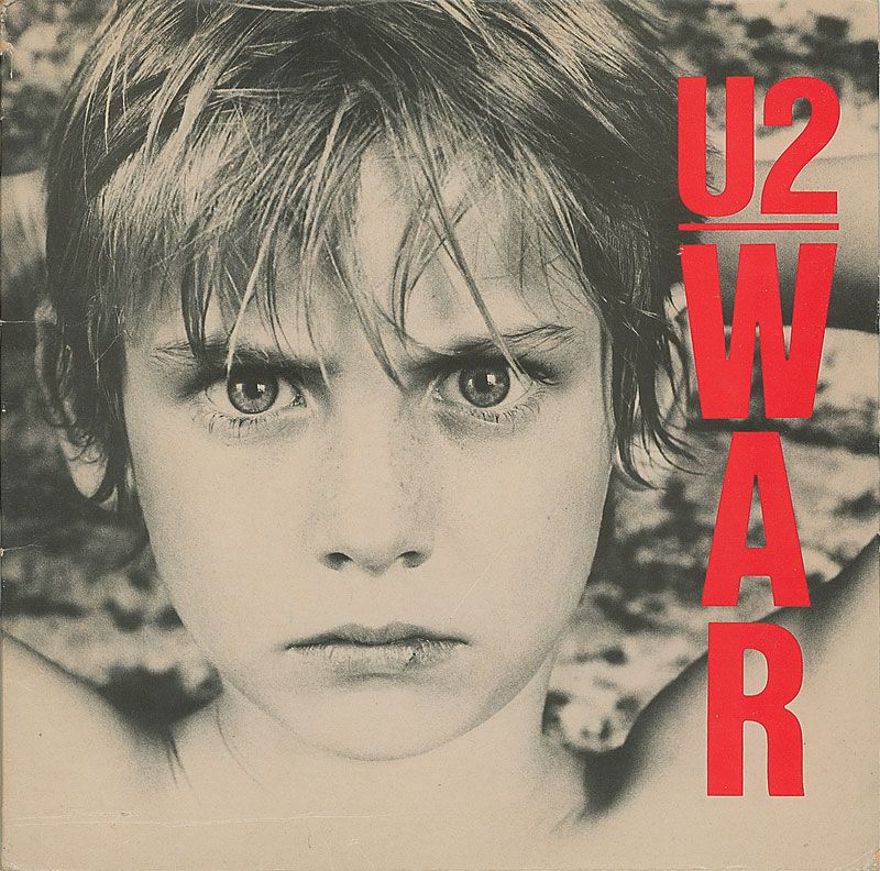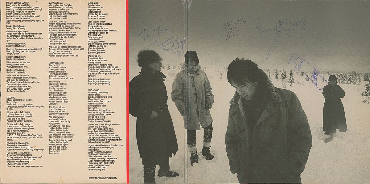 War album signed and inscribed on the inside gatefold in blue and black ballpoint by Bono, Edge, Adam Clayton, and Larry Mullen, Jr., all signing first names only. In fine condition, with Mullen writing over a previous unsuccessful attempt, a couple cover creases, and slight edge wear. The record is not included.