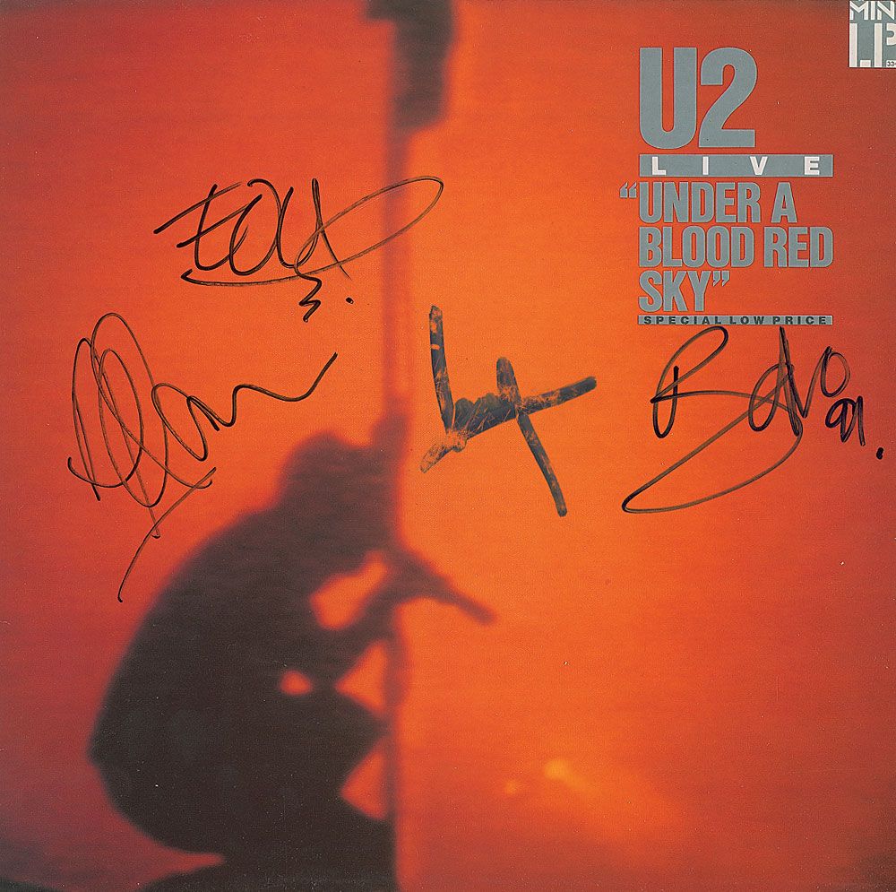 Under a Blood Red Sky album signed on the front cover in black felt tip, “Bono 91,” “Edge,” “Adam,” and “Larry.” In fine condition, with irregular ink adhesion to Larry Mullen’s signature. The record is included. Consignor notes that this was signed in 1991 for a Radio 1 giveaway to celebrate the release of Achtung Baby.