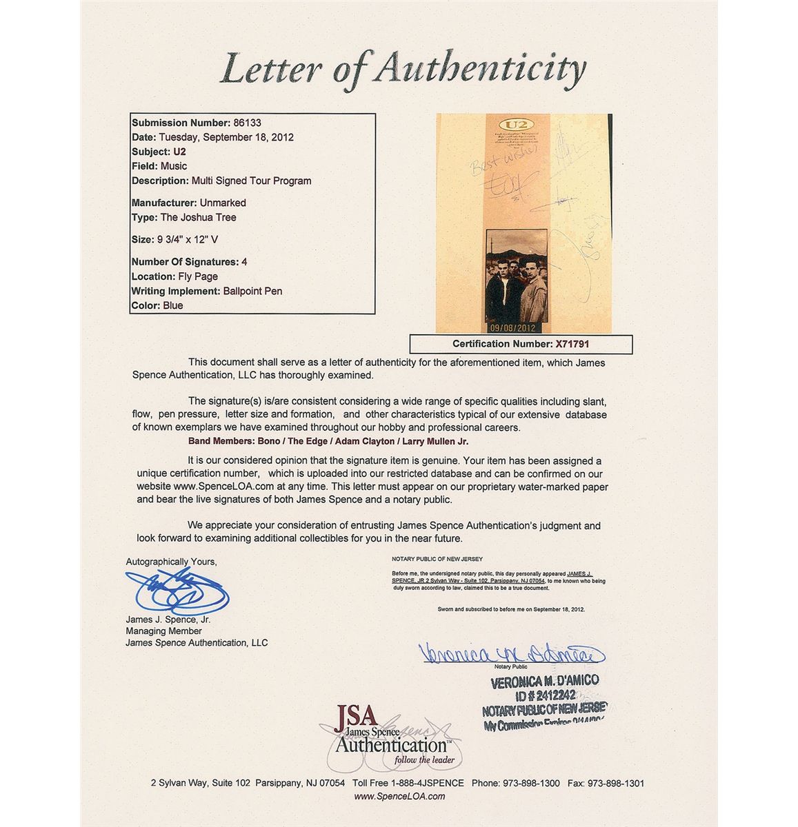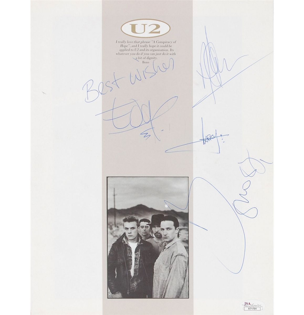 Joshua Tree tour program, 9.5 x 12.5, signed on the first page in blue ballpoint, “Bono 88,” “Best wishes, Edge,” “Adam,” and “Larry.” In fine condition, with a James Spence authentication label affixed to lower corner of signed page. Accompanied by a full letter of authenticity from James Spence.