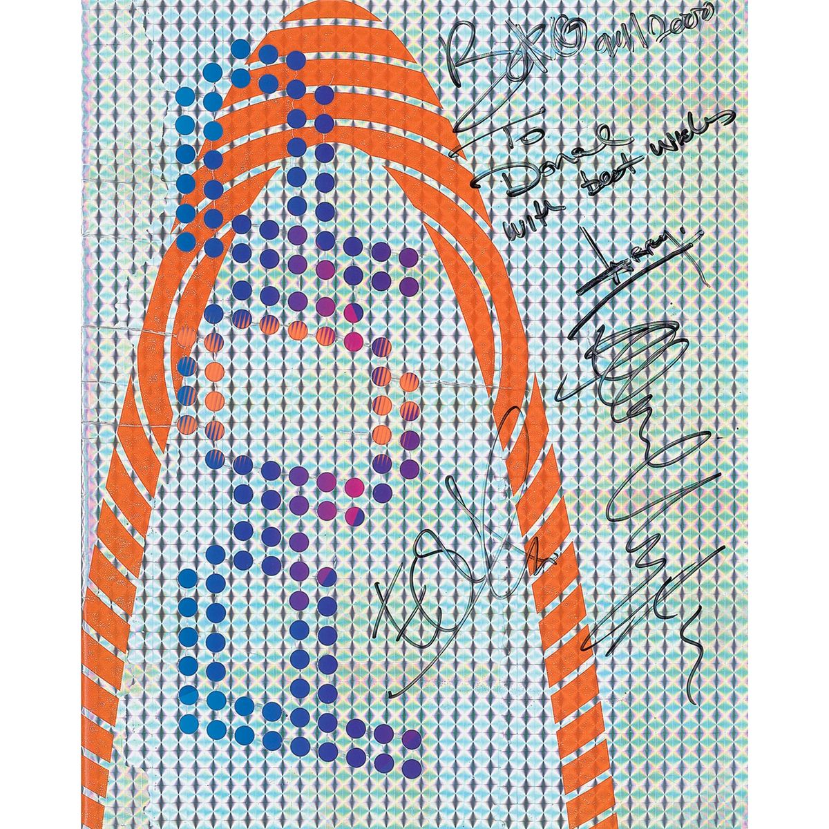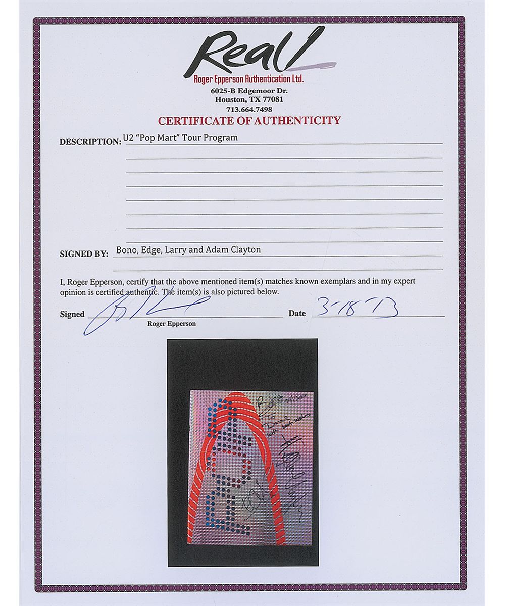 Concert program from the band’s PopMart tour, 9.75 x 12, signed on the front cover in black felt tip by Bono, adding “2000,” Edge, Adam Clayton, and Larry Mullen, signing with his first name only and adding a brief inscription. In fine condition. The band’s 1997–1998 tour comprised of five legs and a total of 93 multi-media shows around the world. Accompanied by a full letter of authenticity from Roger Epperson/REAL.