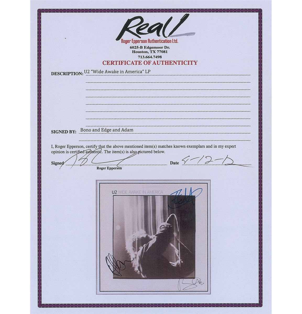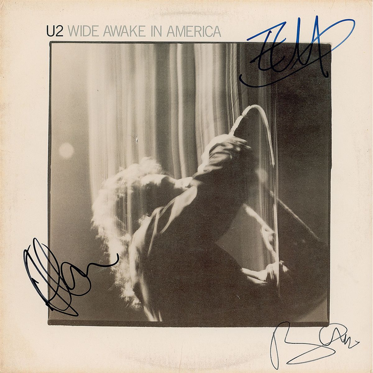 Wide Awake in America album signed in blue felt tip by Edge and in black felt tip by Bono and Adam [Clayton]. In fine condition. The record is not included. Accompanied by a full letter of authenticity from PSA/DNA and a full letter of authenticity from Roger Epperson/REAL.