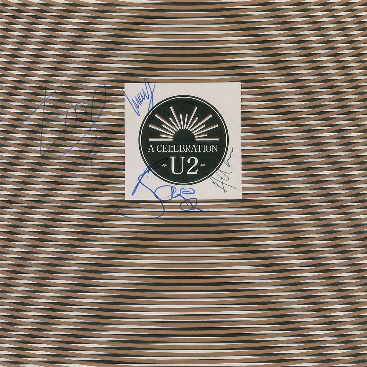 ‘A Celebration/Trash, Trampoline and The Party Girl’ 45 rpm record, signed on the sleeve in blue ballpoint, “Bono 82,” “Edge,” and “Larry,” and in black ballpoint, “Adam.” In fine condition, with light to moderate contrast to Edge’s signature. Accompanied by a full letter of authenticity from Roger Epperson/REAL.