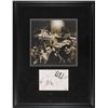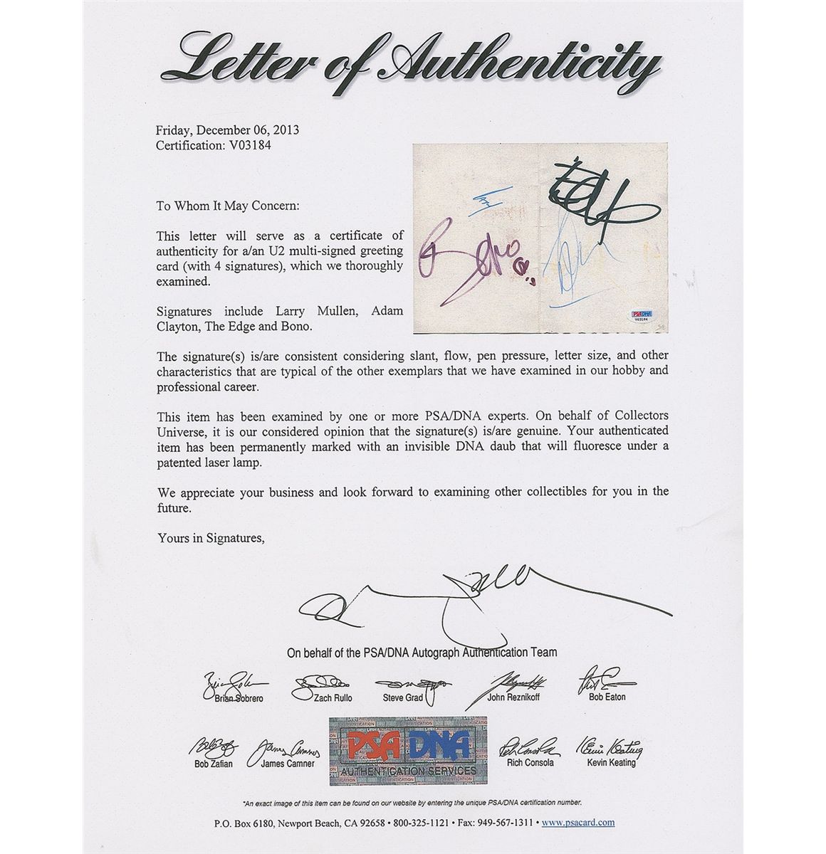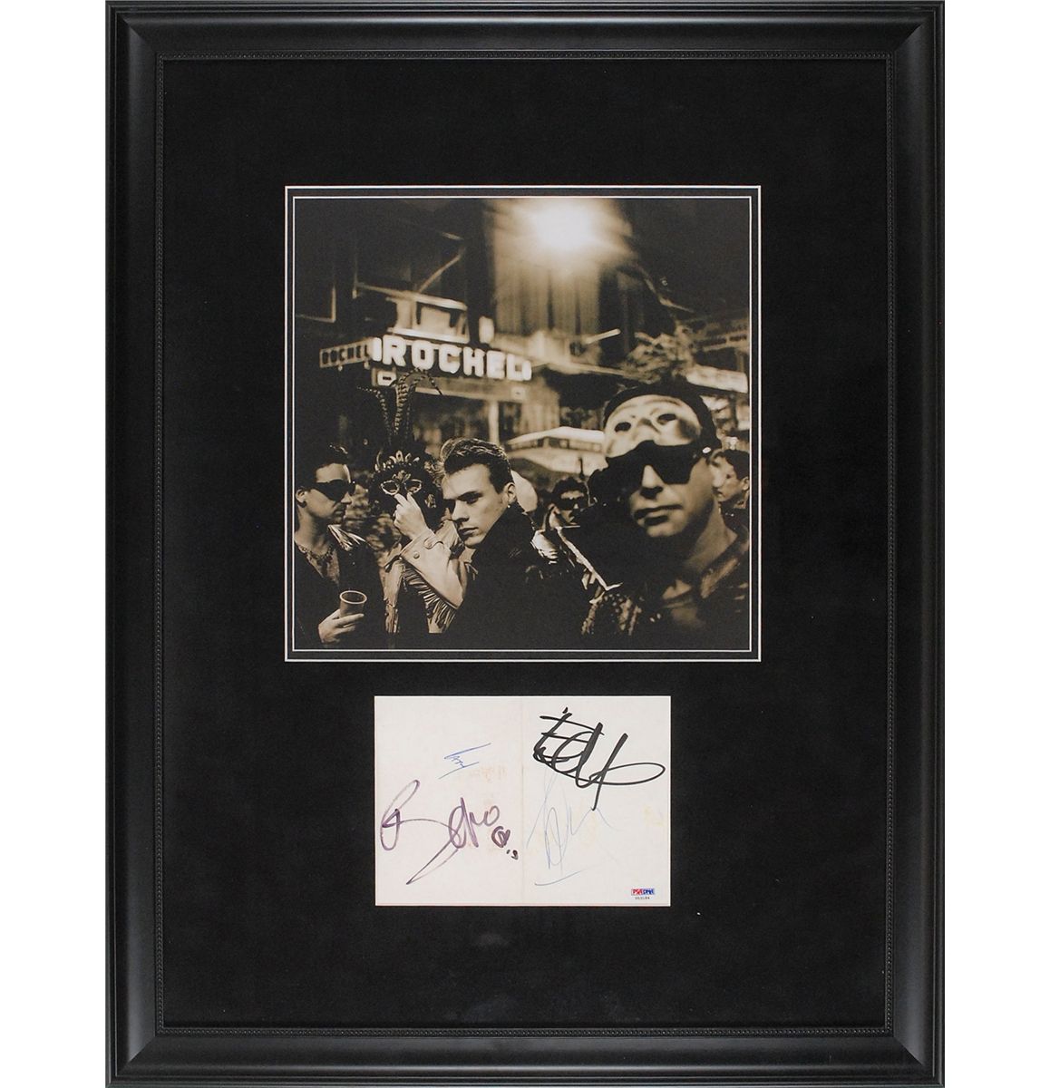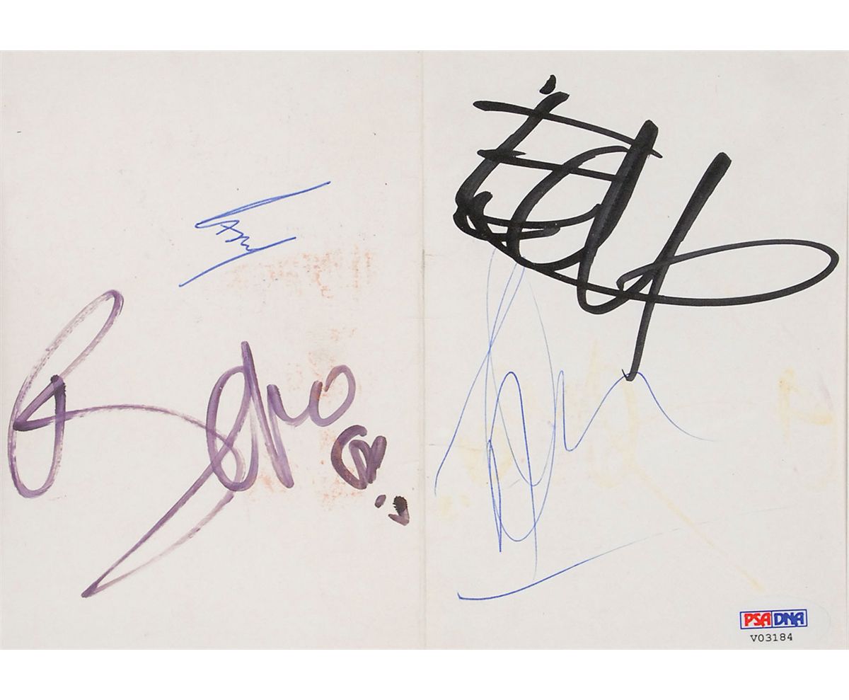 Felt tip and ballpoint signatures of Bono, Edge, Adam [Clayton], and Larry [Mullen, Jr.], on an off-white 7.75 x 5.5 card. Matted and framed with an oversized image of the band on a city street to an overall size of 22.25 x 28.5. In fine condition, with some scattered light toning and soiling and a PSA/DNA authentication label affixed to lower right corner. Accompanied by a full letter of authenticity from PSA/DNA.