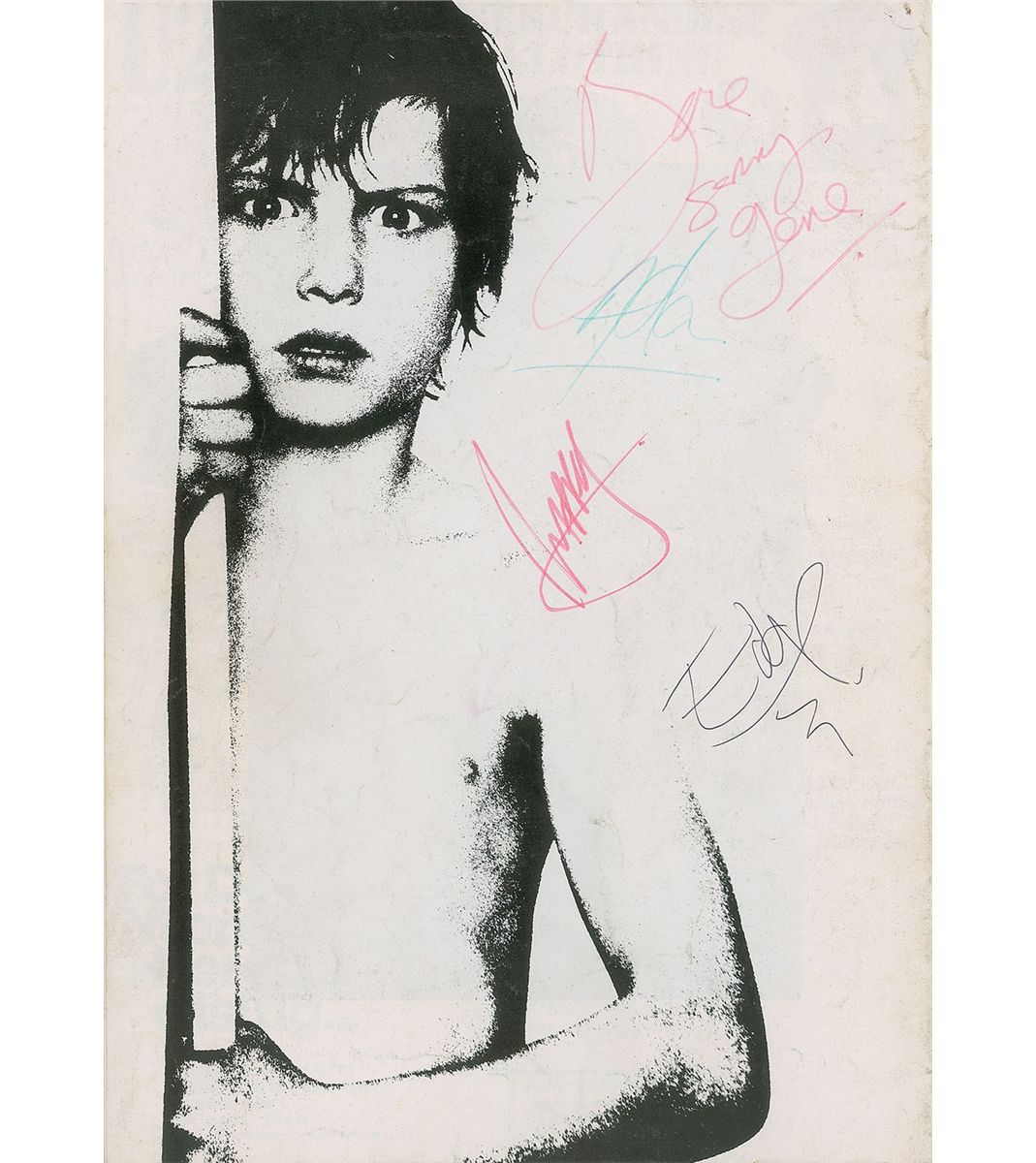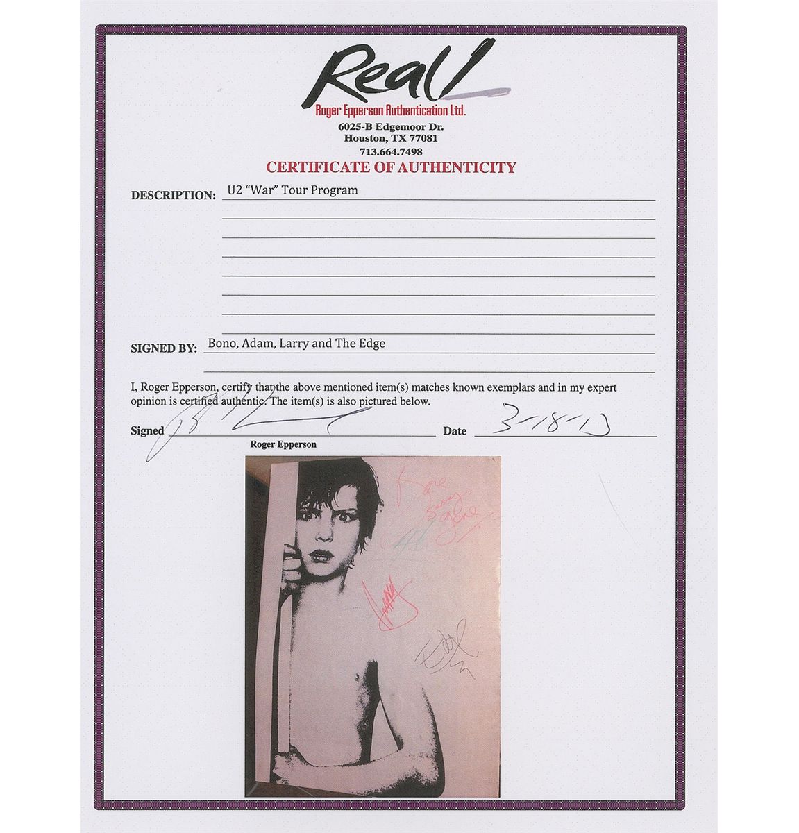 Concert program from the band’s 1982–1983 War tour, 8.25 x 11.75, signed on the back cover in ballpoint and felt tip, “Bono, Sorry Gene,” “Edge,” “Larry,” and “Adam.” Expected handling wear, some old tape remnants to front cover, some light soiling, and Adam’s signature a shade or two lighter than the others, otherwise fine condition. Accompanied by a full letter of authenticity from Roger Epperson/REAL.