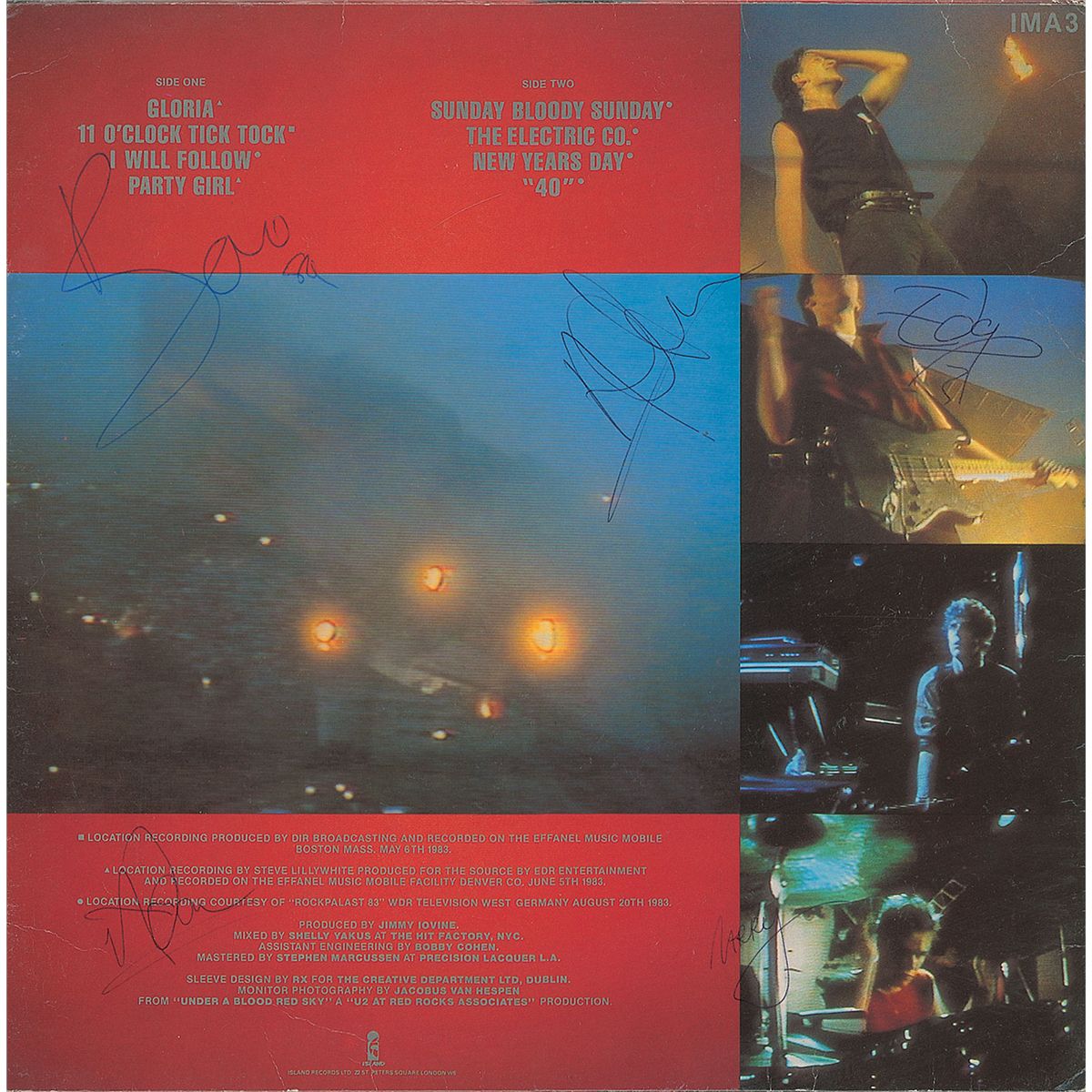 Under A Blood Red Sky album signed on the back cover in ballpoint, “Bono 89,” “Edge,” “Larry,” and twice by “Adam.” Scattered creases to both covers, otherwise fine condition. The record is included. A highly desirable, fully-signed copy of the album that helped establish U2’s reputation as one of the greatest live rock bands—a reputation that they continue to live up to three decades later.