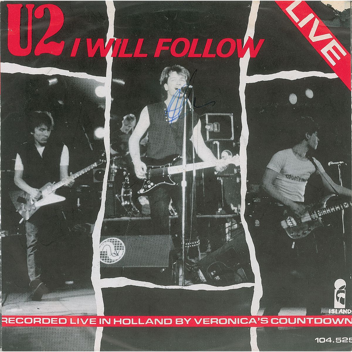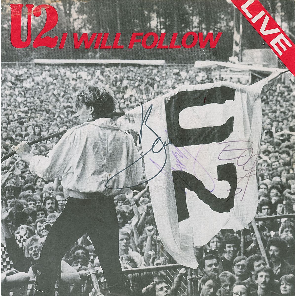 45 rpm record of ‘I Will Follow Live,’ signed on the front of the sleeve in black felt tip by Edge and Bono, and in blue ballpoint “Larry,” and on the back of the sleeve in blue ballpoint, “Adam.” Moderate contrast to Clayton’s signature, Larry’s signature a bit light, and a tape remnant along top edge, otherwise fine condition. ‘I Will Follow’ is the only song the band has performed on every tour.