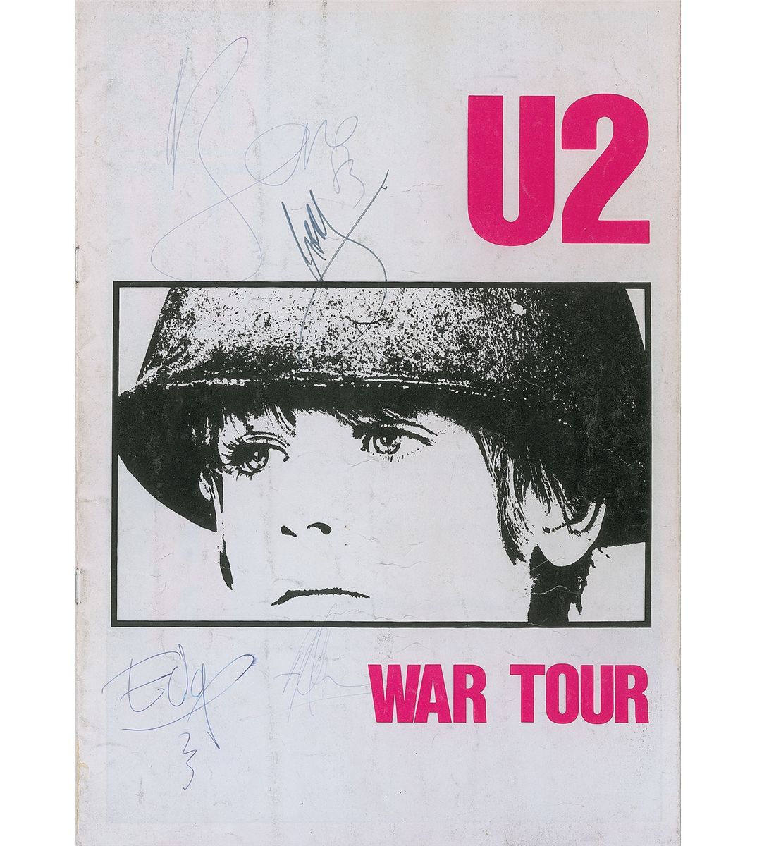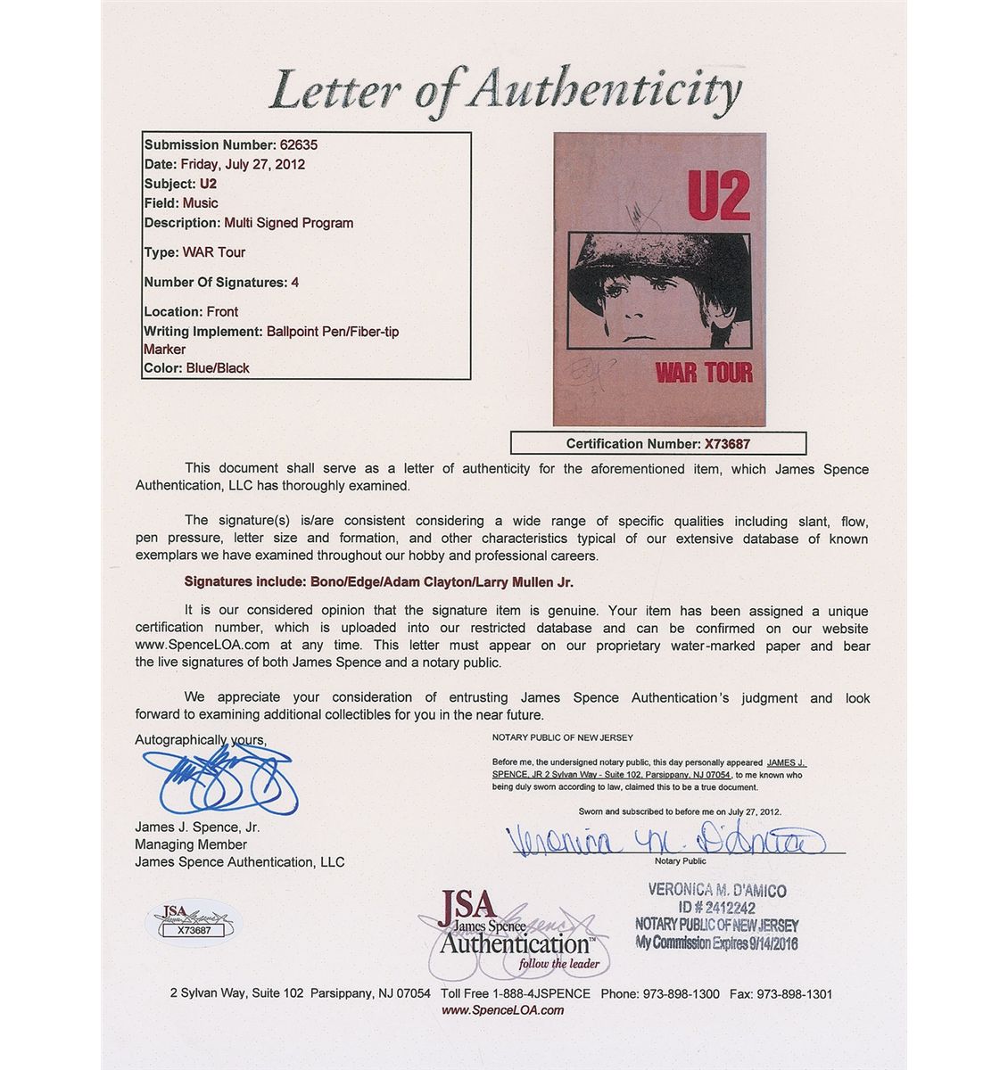 Concert program from the band’s War tour, 8.25 x 11.75, signed on the front cover in blue ballpoint, “Bono 83,” “Edge,” and “Adam,” and in black felt tip, “Larry.” A guest pass is affixed to the back cover. In very good condition, with several vertical folds, moderate handling wear, Adam’s signature fairly light, but still legible, and some ink notations inside. Accompanied by a full letter of authenticity from James Spence.