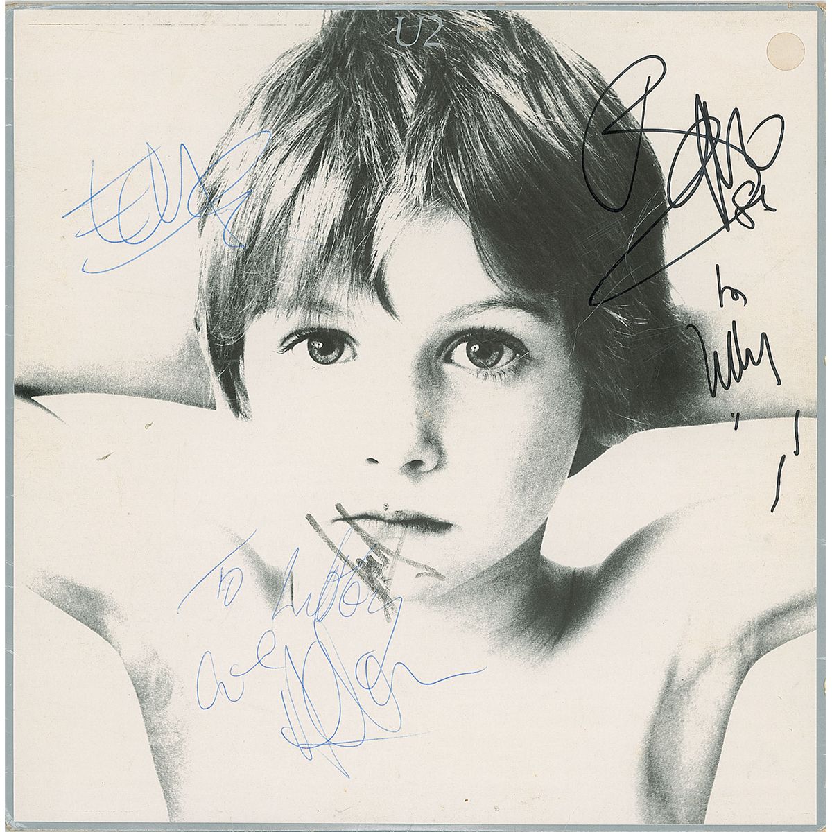 Boy album signed on the front cover in black felt tip, “Bono 89,” and “Larry,” and in blue ballpoint, “Edge,” and “To Libby, Love Adam.” In fine condition, with some scattered light wear and creases and a small label affixed to top right corner. The record is included. All signatures were obtained in September of 1989 in Sydney, Australia. Accompanied by a printed account from the recipient of the signatures, as well as seven color glossy candids of the band meeting with fans while in Sydney.